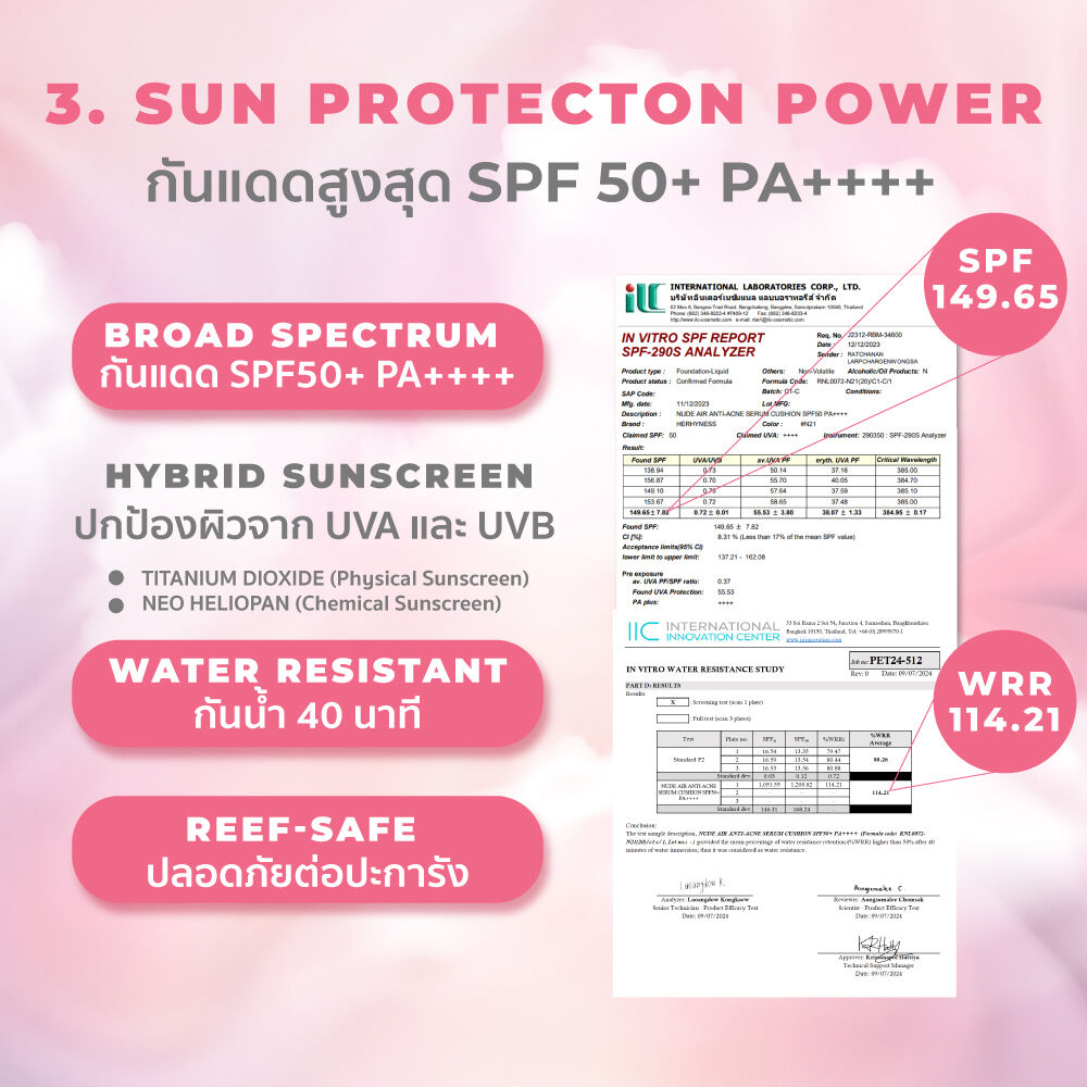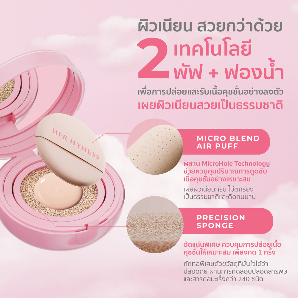 HER HYNESS Nude Air Anti-Acne Serum Cushion SPF50+ PA++++ [12g x 2pcs] #21N Light บอกลาสิว เบลอผิวขั้นสุดด้วย 3 พลังคุชชั่นเซรั่ม เพื่อผิวแพ้และเป็นสิวง่าย ด้วย Makeup Power เบาขั้นสุด ปกปิด คุมมัน ติดทนนาน ให้ผิวกึ่งแมทเป็นธรรมชาติด้วย Sphere Sebum Technology และ Avocado Oil ทดแทนการใช้ซิลิโคน ลดโอกาสอุดตันผิว และ Skincare Power ส่วนผสมบำรุงผิว 80% จัดการทุกปัญหาสิวด้วย Miracne พร้อมบูสต์ผิวใสด้วย Double Encapsulation of Vitamin C & E มาพร้อม Sun Protection Power กัน UVA และ UVB สูงสุดด้วย SPF50+ PA++++ กันน้ำ กันเหงื่อ 40 นาที ปลอดภัยต่อปะการัง