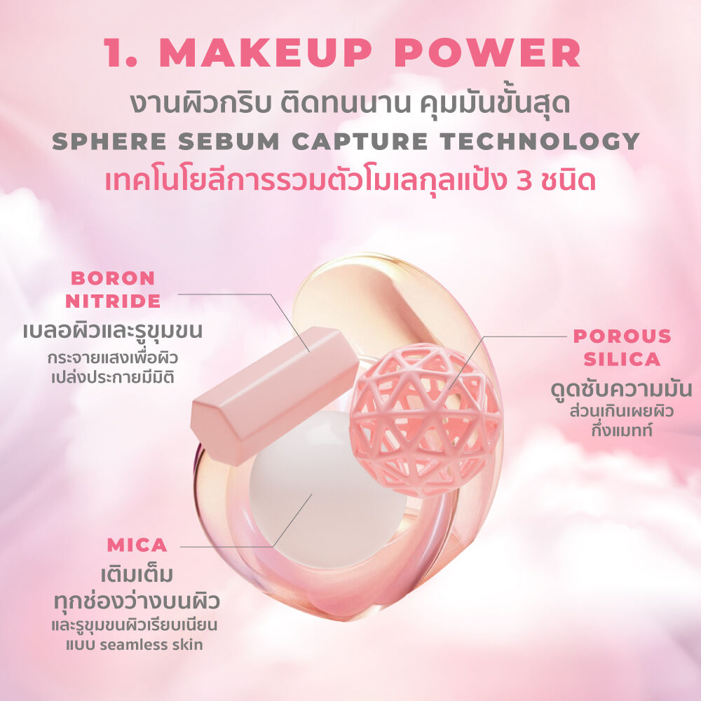 • Sphere Sebum Technology: เทคโนโลยีการรวมตัวของโมเลกุลแป้ง 3 ชนิด เบาสบายผิว เรียบเนียน ติดทนนาน
