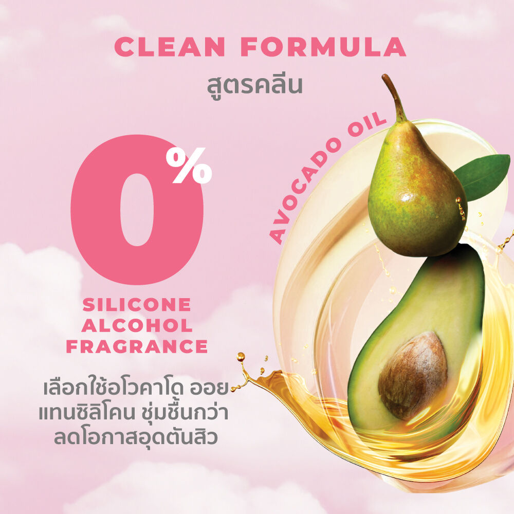 • Pore-Friendly: 0% Silicone ด้วย Avocado Oil ทดแทนซิลิโคน ลดโอกาสอุดตันผิว ชุ่มชื้นมากกว่า