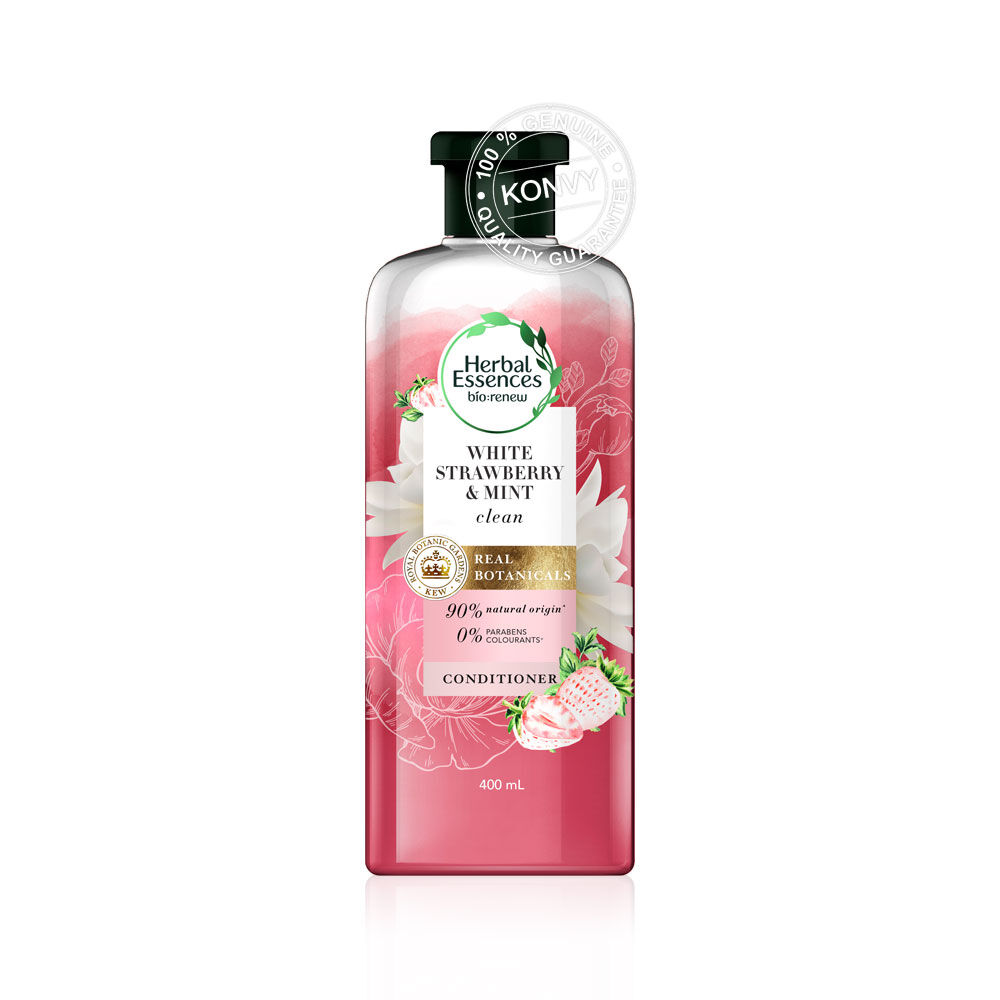 Herbal Essences White Strawberry & Sweet Mint Hair Conditioner 400ml ครีมนวดสูตรไวท์สตรอว์เบอร์รี่ แอนด์ มินท์ มีส่วนผสมของไวท์ สตรอเบอร์รี่ อุดมไปด้วยวิตามินซี ช่วยฟื้นฟูและคืนความมีชีวิตชีวาให้เส้นผม