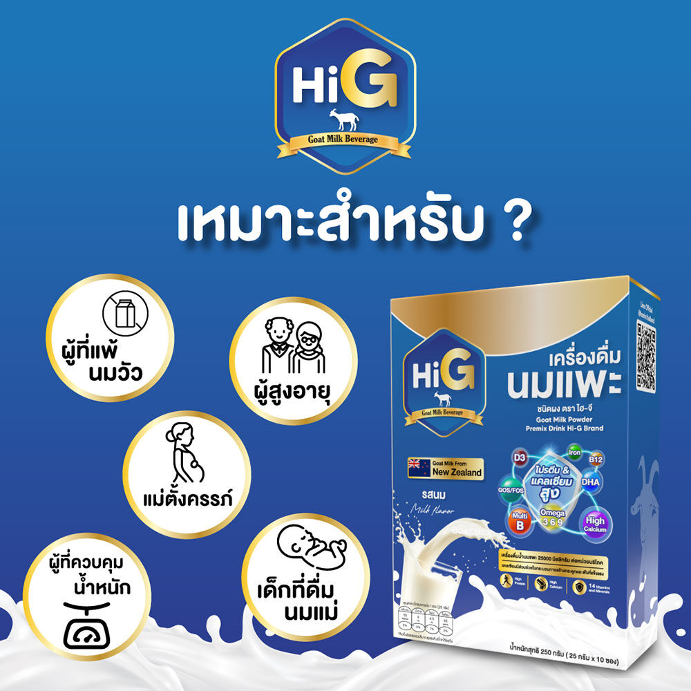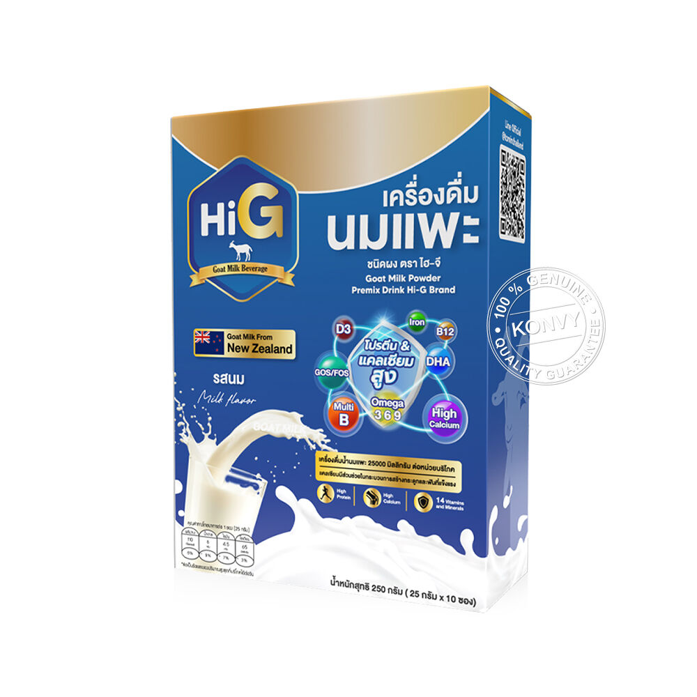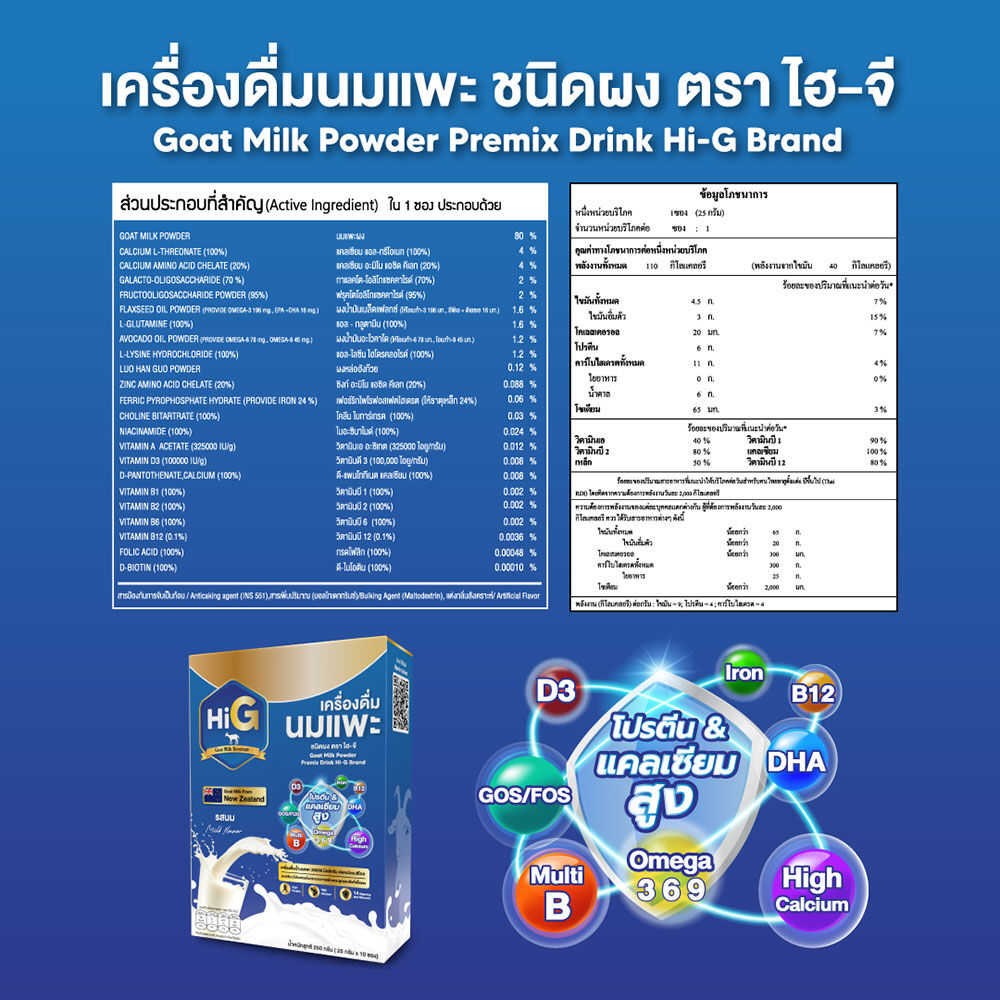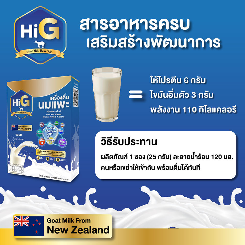 Hi-G Goat Milk Powder Premix Drink [25g x 10 Sachets] เครื่องดื่มนมแพะชนิดผง ผลิตจากนมแพะธรรมชาติ จากฟาร์มที่ได้มาตรฐานสูงในประเทศนิวซีแลนด์ รสชาติหอมอร่อย มีสารอาหารสำคัญครบถ้วน ให้โปรตีน และแคลเซียมสูง