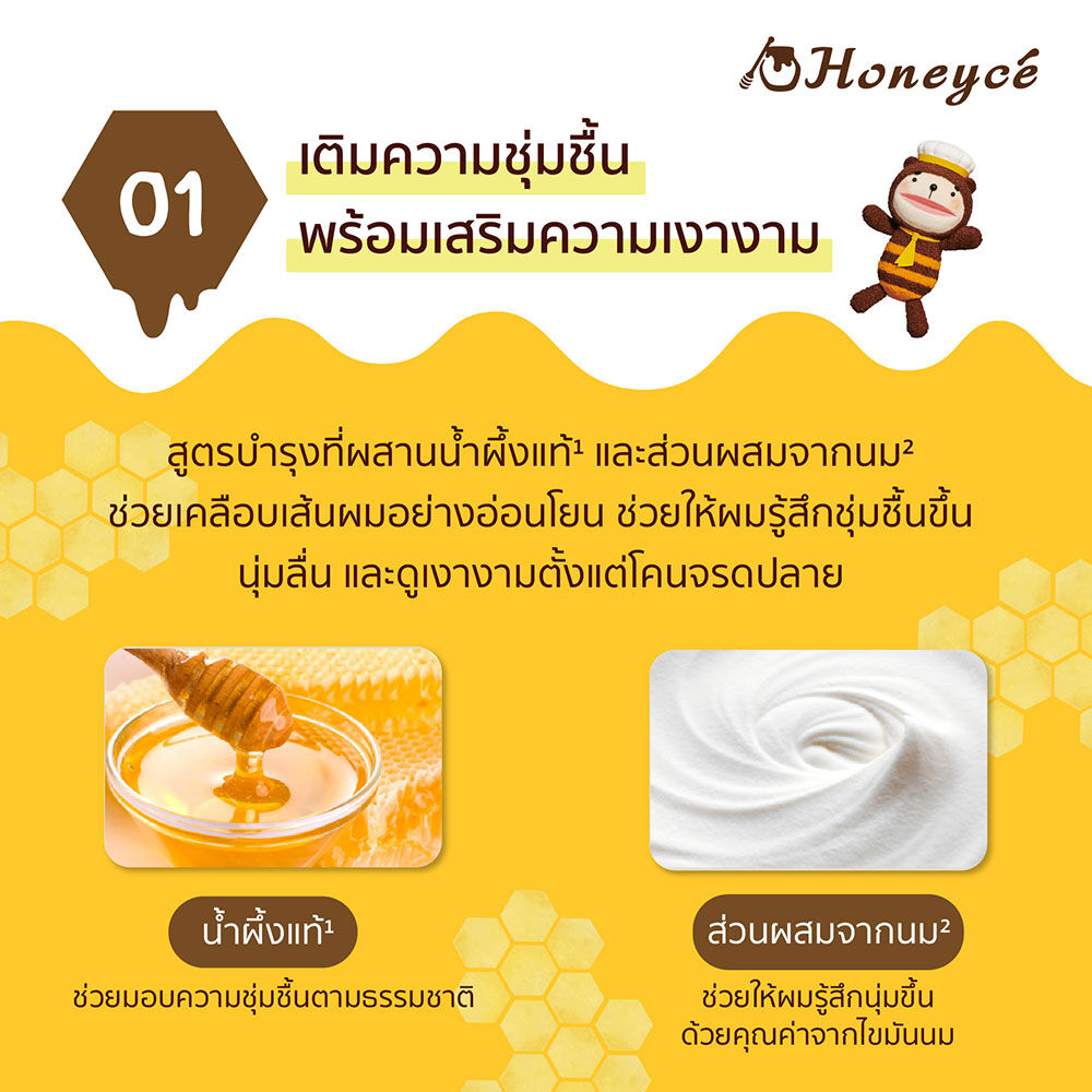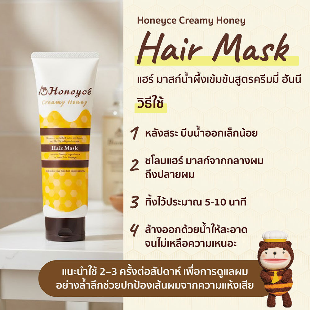 Honeyce Creamy Honey Hair Mask 200g มาสก์บำรุงเส้นผม ด้วยนวัตกรรมของเนื้อวิปครีมที่ผสานกับ Shea Butter เพิ่มความเข้มข้นการบำรุงจึงช่วยให้เนื้อครีมลื่น เกลี่ยง่าย พร้อมกับนำพาสารบำรุงเข้าบำรุงได้อย่างง่ายดาย ด้วยส่วนผสมของ Honey บริสุทธิ์ โดยไม่ผ่านความร้อนจึงคงคุณค่าสารบำรุงไว้เต็มเปี่ยมพร้อมด้วย Hydrolyzed Honey Protein และ Milk Lipids ช่วยเพิ่มความนุ่มลื่น เพิ่มความชุ่มชื้นให้กับเส้นผม พร้อมด้วยส่วนผสมของ GAMMA-Docosalactone เคลือบบำรุงให้ผมแลดูเงางาม ลดโอกาสเกิดการแตกปลาย และอนุพันธ์ของ Lysine ซึ่งเป็นกรดอะมิโนที่พบบนเส้นผม ช่วยบำรุงผมแห้งเสียให้ นุ่มสลวย จัดทรงง่าย ไม่ชี้ฟู