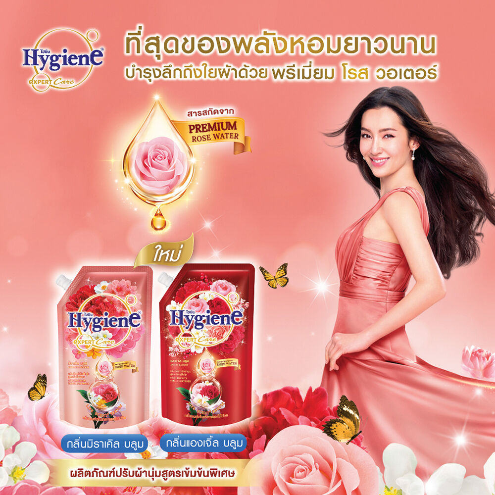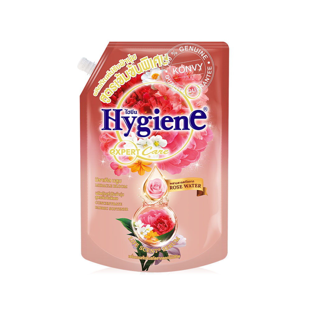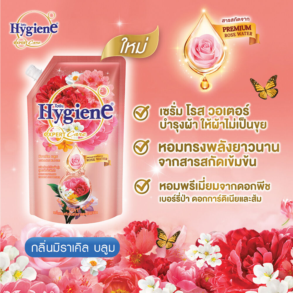 Hygiene Expert Care Life Scent Concentrate Fabric Softener Miracle Bloom 1100ml น้ำยาปรับผ้านุ่มสูตรเข้มข้นพิเศษ กลิ่นมิราเคิล บลูม ใหม่ ที่สุดของพลังความหอมยาวนาน บำรุงล้ำลึกถึงใยผ้าด้วยพรีเมี่ยม โรส วอเตอร์ครั้งแรกของการผสาน 2 เทคโนโลยีในการดูแลผ้า ที่สุดของพลังหอมยาวนานจากเซรั่มหอมเข้มข้นสกัดจากดอกไม้มีชีวิตด้วยเทคโนโลยี Life Scent® ไลฟ์ เซ้นท์ สกัดกลิ่นหอมเข้มข้นบริสุทธิ์ 100% มีเฉพาะไฮยีนผสาน Premium Rose Water จากหุบเขาชื่อดังในยุโรป บำรุงลึกขั้นสุดถึงใยผ้า เปรียบเสมือนมอยเจอร์ไรเซอร์ในการบำรุงผ้า ประสบการณ์ใหม่ของการดูแลผ้าอย่างล้ำลึก พร้อมพลังความหอมเข้มข้นตลอดการสวมใส่ กลิ่นมิราเคิล บลูม ความหอมหวานพรีเมี่ยม เปล่งประกายระยิบระยับของดอกพีชจากญี่ปุ่น ความสดใสซาบซ่าของเหล่าเบอร์รี่ป่าและส้ม ผสานความหอมละมุนเลอค่าของดอกการ์ดิเนีย พร้อมสัมผัสกลิ่นไอของฤดูใบไม้ผลิอันสดใส มอบประสบการณ์ความหอมพิเศษเสมือนอยู่ท่ามกลางทุ่งดอกไม้ ให้คุณรู้สึกหอมสดชื่นยาวนานตลอดการสวมใส่