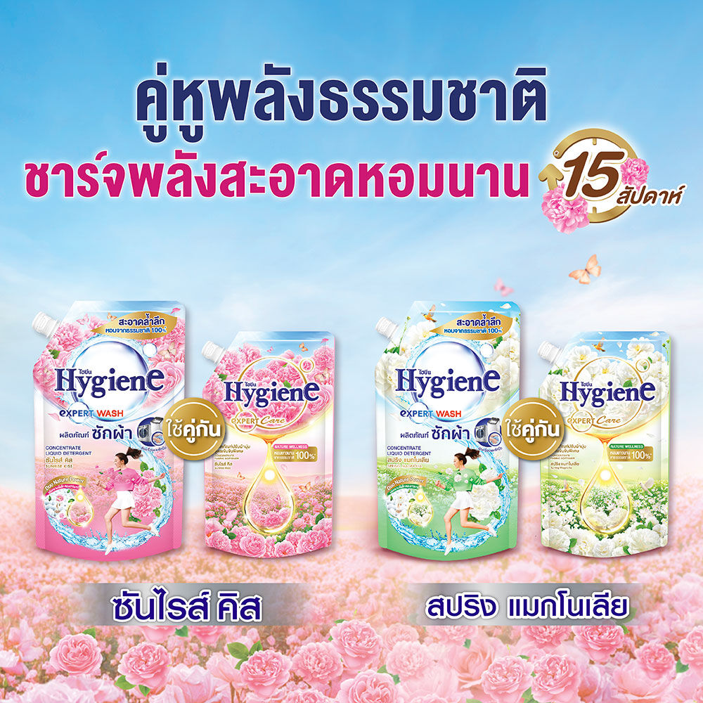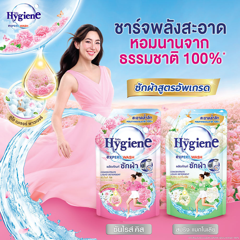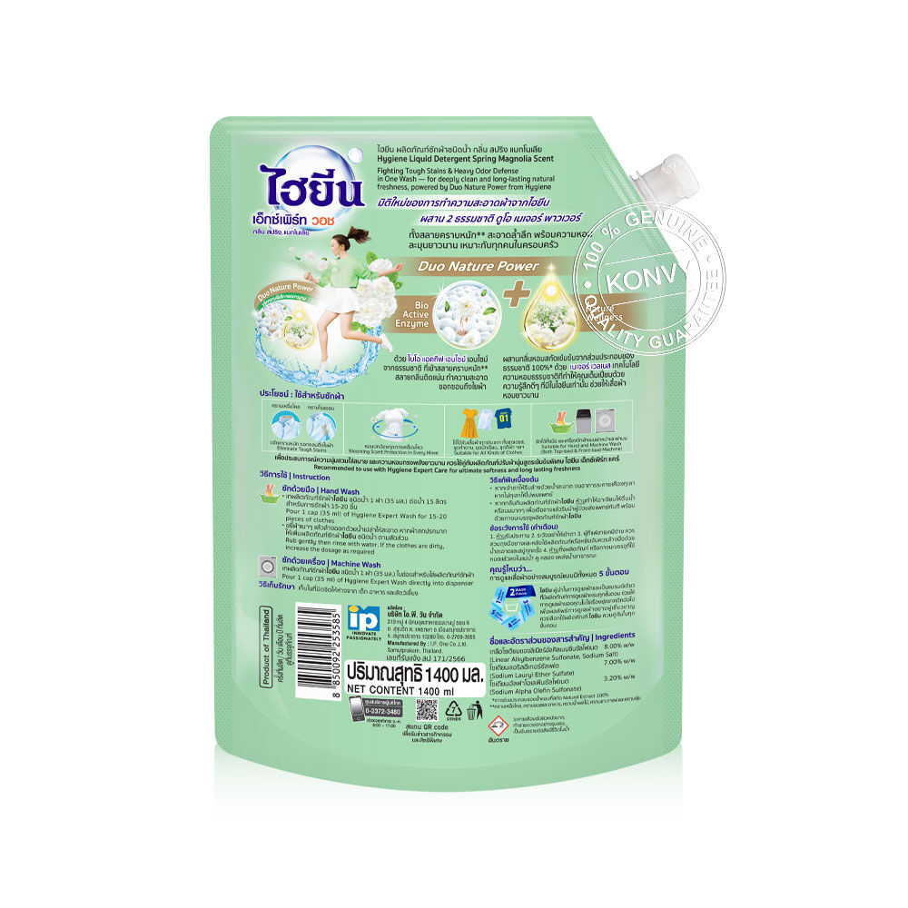 Hygiene Expert Wash Liquid Detergent Spring Magnolia 1400ml ผลิตภัณฑ์ซักผ้าชนิดน้ำ กลิ่นสปริง แมกโนเลีย ด้วยมิติใหม่ของการซักผ้ามิติใหม่ของการซักผ้าด้วยเทคโนโลยีดูโอ แอคทีฟ เซ้นท์ ที่ผสาน 2 แอคชั่นในการซักเพียงครั้งเดียว ช่วยขจัดคราบหนัก และกลิ่นติดแน่น ปกป้องเสื้อผ้าระหว่างวันด้วยพลังความหอมจาก นวัตกรรม LIFE NATURE® ที่สกัดกลิ่นหอมเข้มข้นจากส่วนประกอบของธรรมชาติ