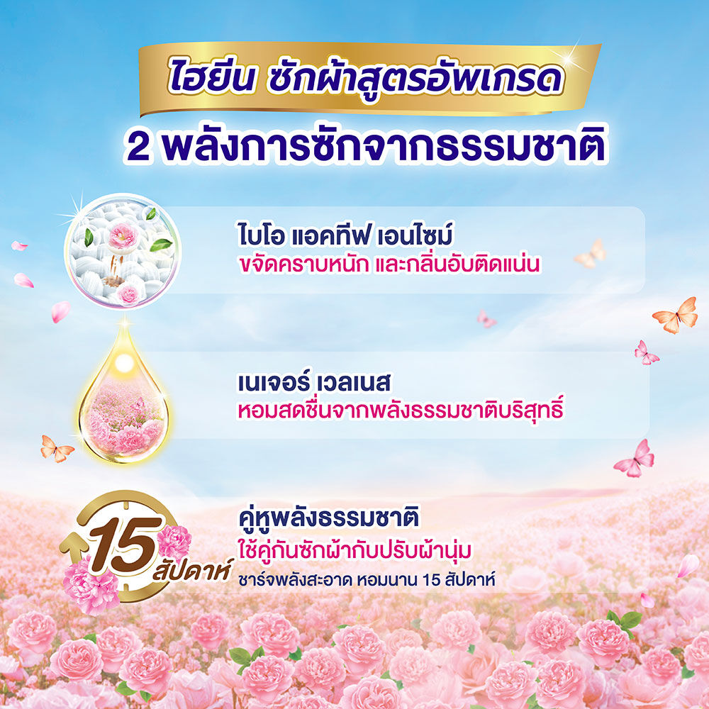 • เทผลิตภัณฑ์ซักผ้าไฮยีน ชนิดน้ำ 1 ฝา (35 มล.) ต่อน้ำ 15 ลิตร สำหรับการซักผ้า 15-20 ชิ้น