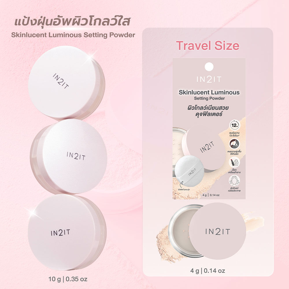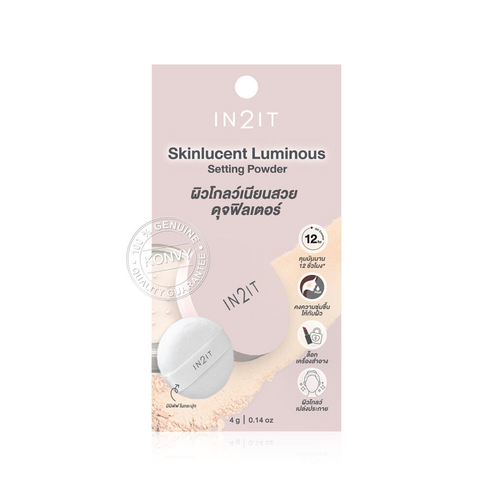In2It Skinlucent Luminous Setting Powder 4g #SLSP01 Moonlit Beige แป้งฝุ่นผสมชิมเมอร์เนื้อเนียนละเอียดเป็นพิเศษ ให้ผิวเปล่งประกาย ปกปิดบางเบา ผ่องใส อุดมไปด้วย Sea water ที่ช่วยคืนความสดชื่นให้ผิว ควบคุมความมันส่วนเกินอย่างเป็นธรรมชาติ ให้ผิวเรียบเนียน เบลอรูขุมขน มีเทคโนโลยี Pro-long Fixed function Technology คงความติดทนนาน ผสานสารสกัดจากธรรมชาติที่ช่วยบำรุงผิวอย่างอ่อนโยน ช่วยปกป้องผิวจากมลภาวะ