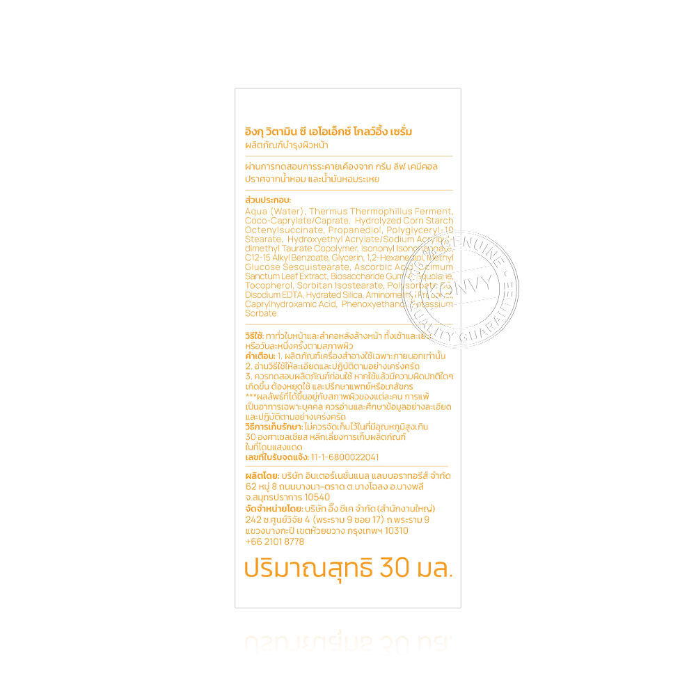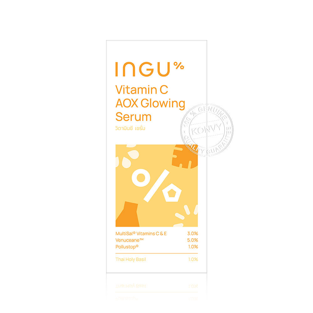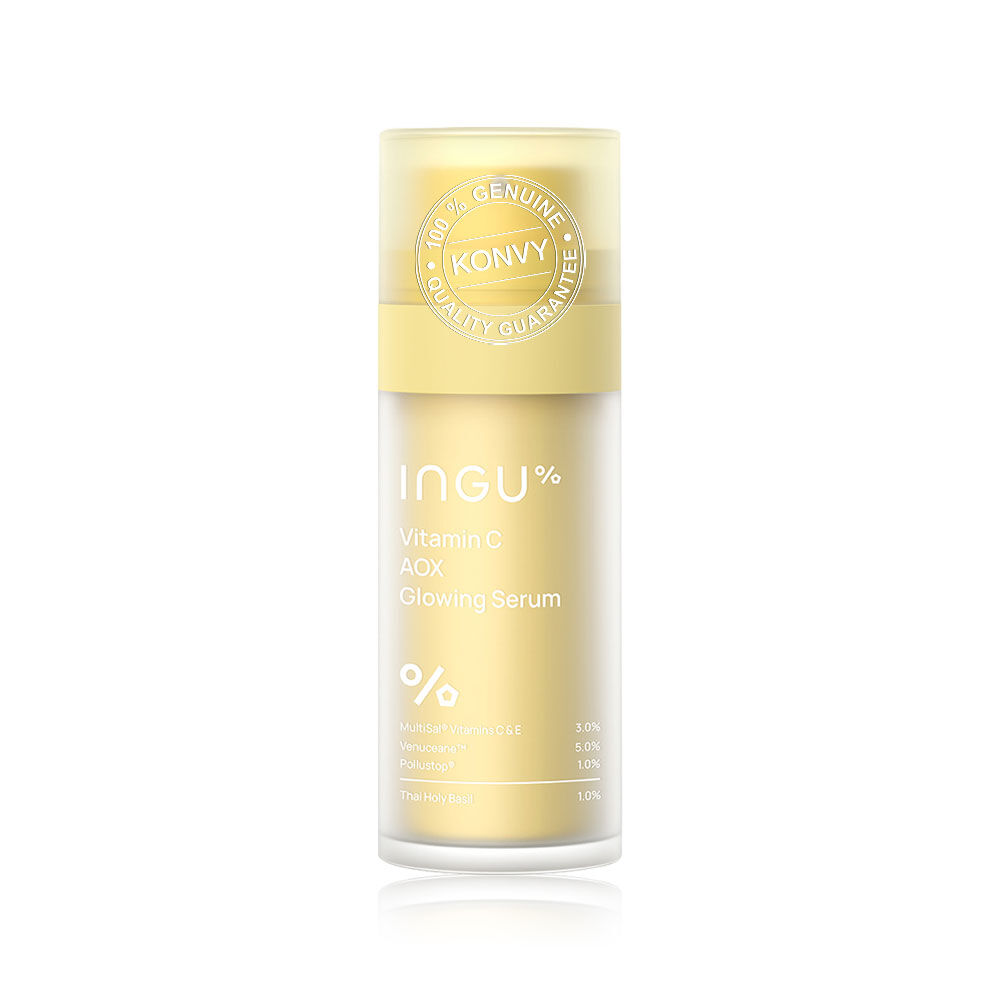 INGU Vitamin C AOX Glowing Serum 30ml เซรั่มบำรุงผิวหน้าเข้มข้น เนื้อบางเบา ซึมเร็ว สบายผิว อุดมด้วยสารสกัดจากกะเพราพื้นถิ่นในประเทศไทย ช่วยปลอบประโลมผิว ผสาน Vitamin C & E ในรูปแบบ Encapsulation ช่วยคงประสิทธิภาพการบำรุงได้นานตลอดวัน เสริมด้วยสารสกัดจากทะเลลึก Venuceane™ และนวัตกรรม Pollustop® ช่วยฟื้นฟูและปกป้องผิวที่โดนทำร้ายจากรังสี UV, ฝุ่น, ควัน และมลภาวะ เผยผิวเรียบเนียน กระจ่างใส ดูสุขภาพดี มีชีวิตชีวา