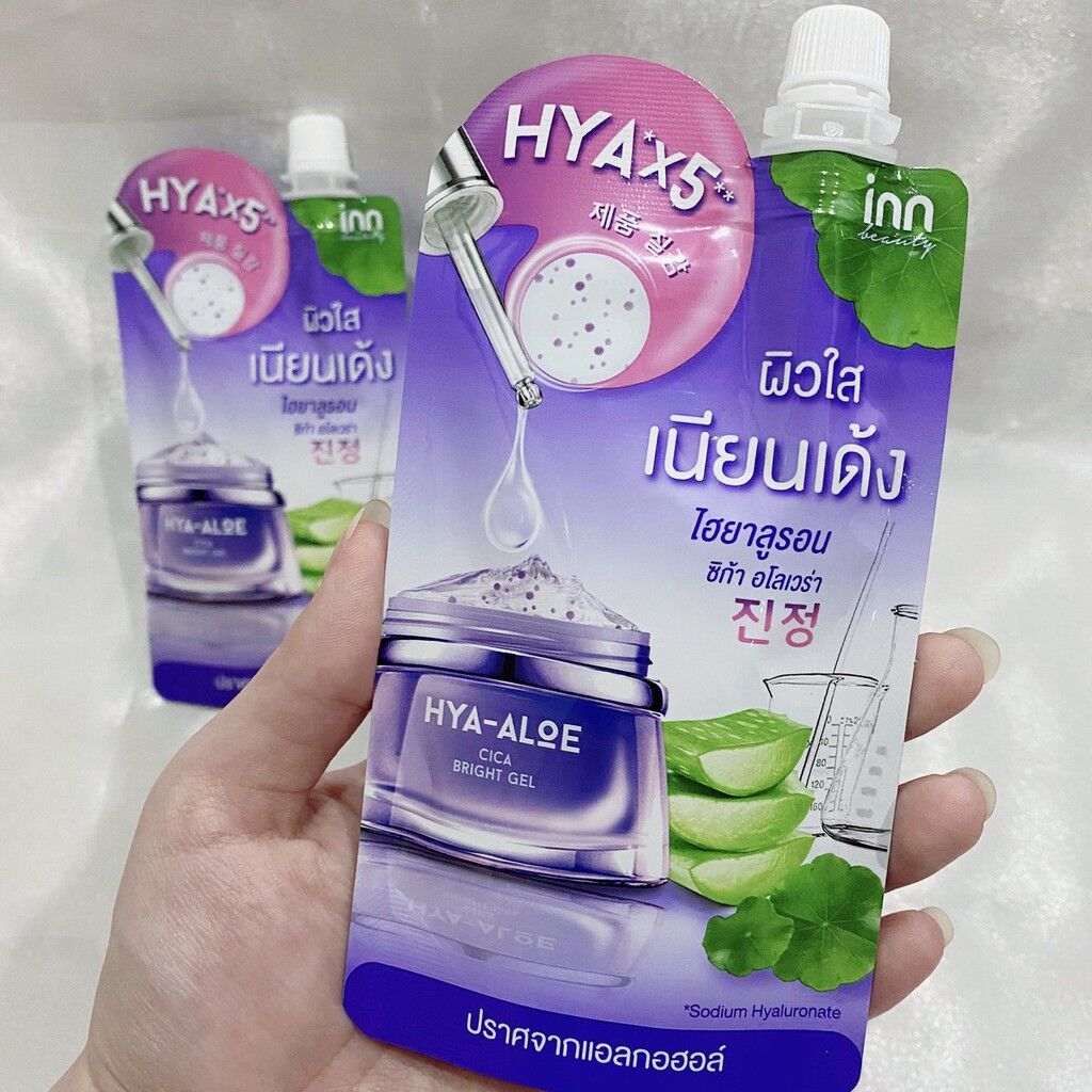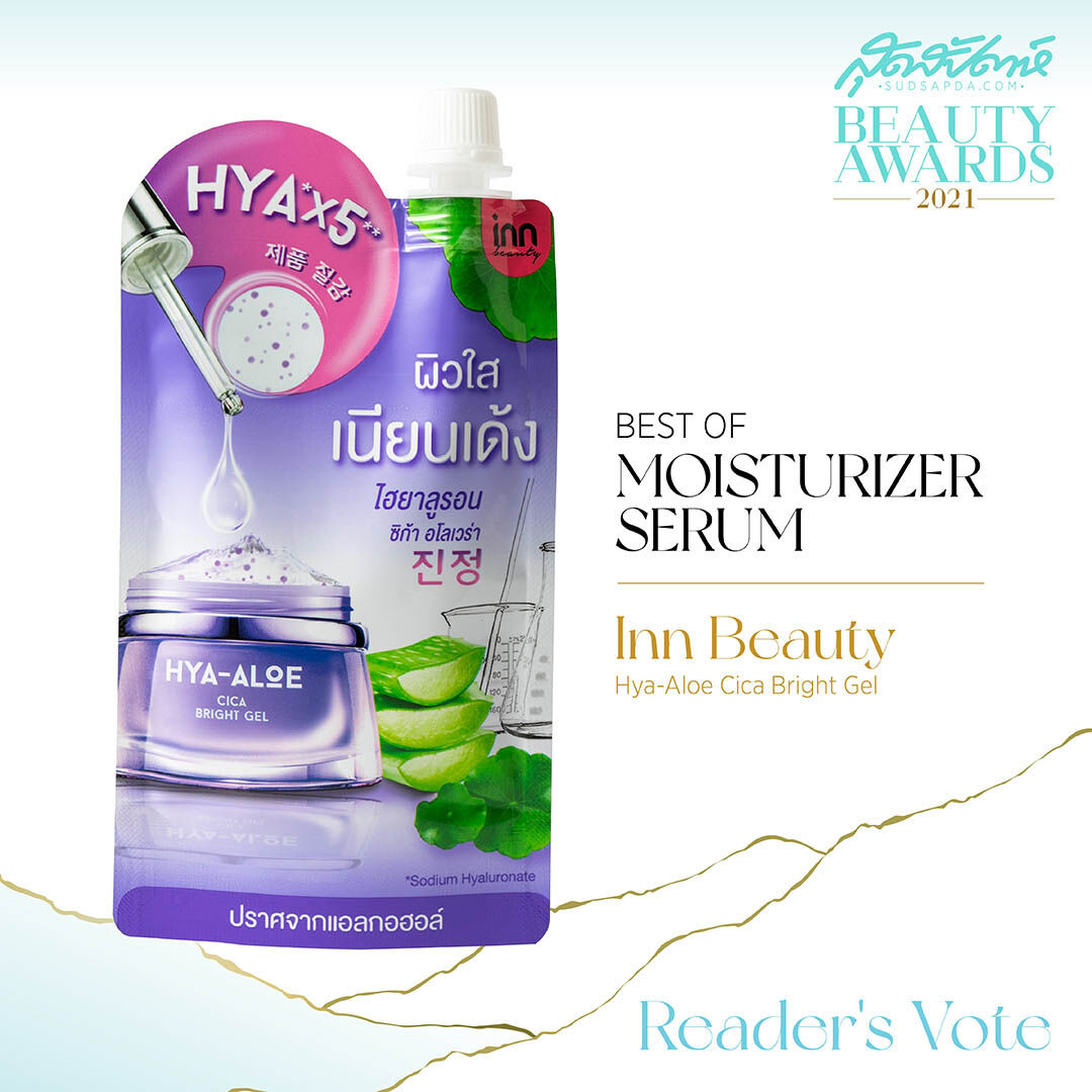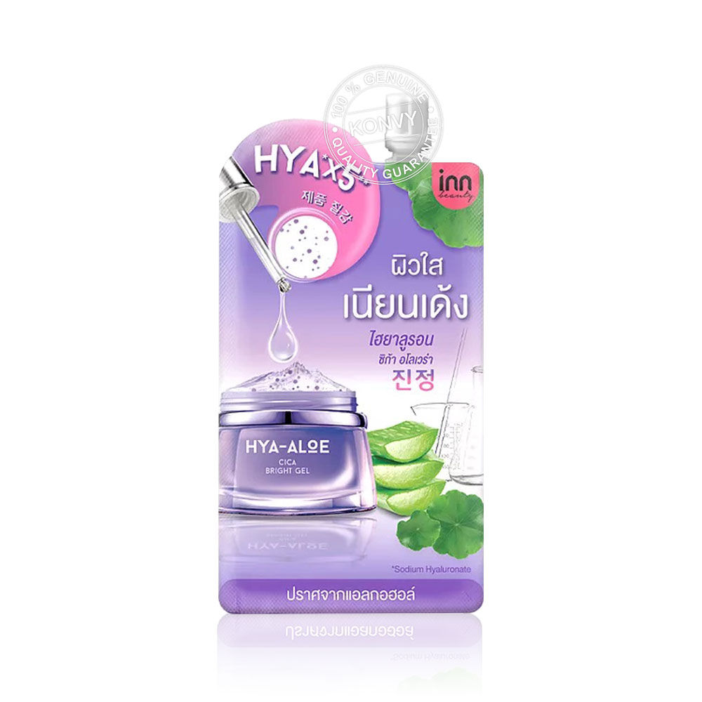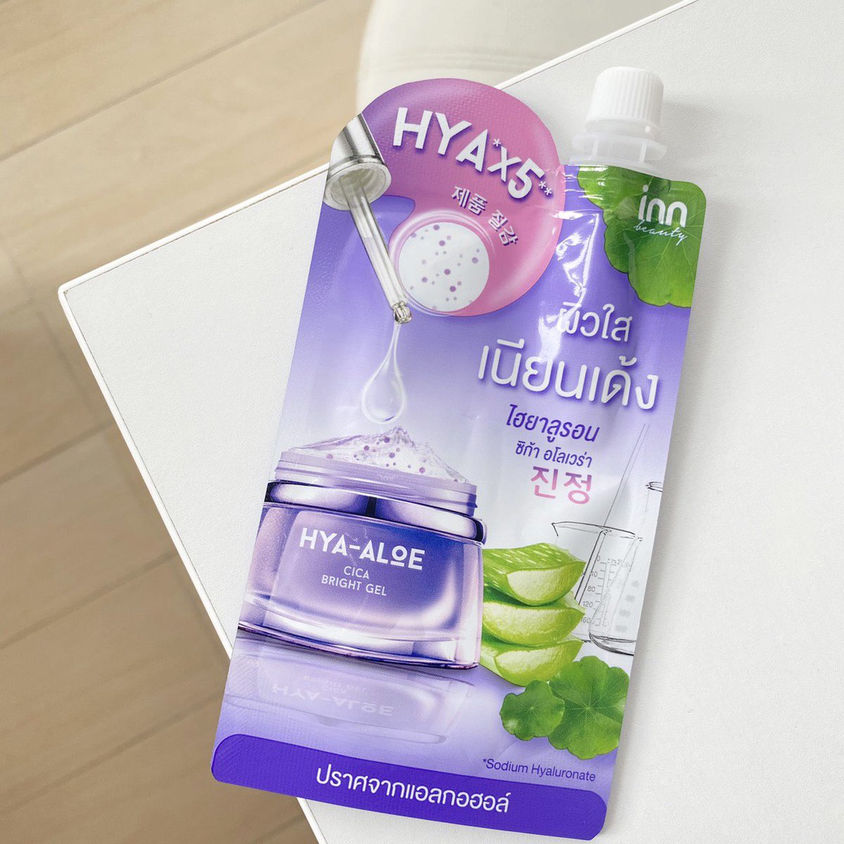 Inn Beauty Hya-Aloe Cica Bright Gel 50g เจลบำรุงผิวหน้าและผิวกาย สูตรปราศจากแอลกอฮอล์ เผยผิวดูกระจ่างใส ช่วยให้จุดด่างดำจากรอยสิวแลดูจางลง พร้อมทั้งบำรุงให้ผิวเนียนนุ่มชุ่มชื้น แลดูมีสุขภาพผิวที่ดี ด้วยคุณค่าจากสารสกัดจากใบบัวบก โซเดียม ไฮยาลูโรเนต และคอลลาเจน ที่ช่วยบำรุงให้ผิวชุ่มชื้นเปล่งปลั่ง แลดูเรียบเนียน วิตามินบี 3 ช่วยบำรุงผิวให้แลดูกระจ่างใสอย่างเป็นธรรมชาติ