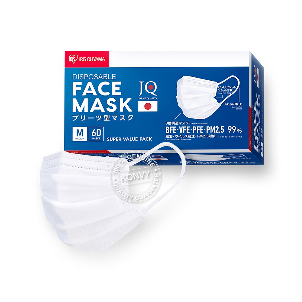 IRIS OHYAMA Disposable Face Mask Size M [60pcs x 3 Boxes] #White หน้ากากอนามัย ไซส์ M สำหรับสวมใส่เพื่อสุขภาพอนามัย ด้วยประสิทธิภาพแผ่นกรองหนา 3 ออกแบบหน้ากาก V-cut หรือมุมเว้าด้านข้างแก้มช่วยกระชับใบหน้า มาพร้อมกับสายรัดนุ่มสบายหูและทรงขอบโค้งมนอ่อนโยนต่อใบหน้า