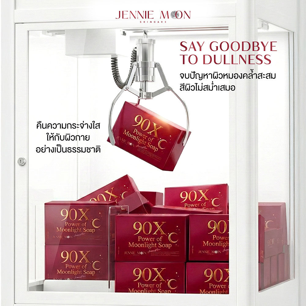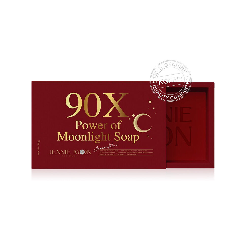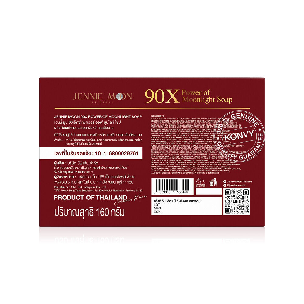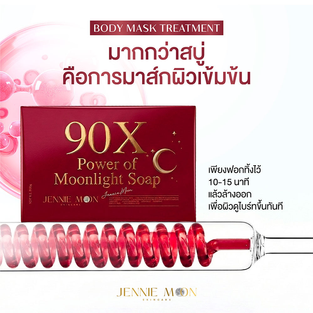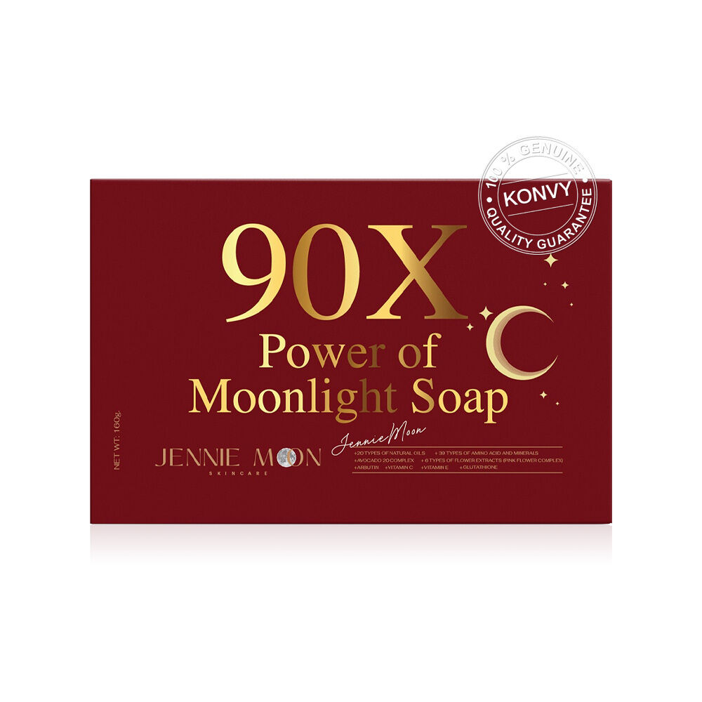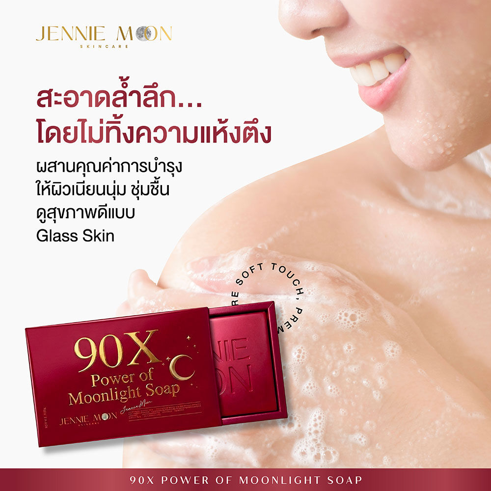 JENNIE MOON 90X Power Of Moonlight Soap 160g สบู่ทำความสะอาดผิวหน้าและผิวกาย ช่วยทำความสะอาดผิวอย่างล้ำลึก โดยไม่ทำให้ผิวแห้งตึง ผสาน Niacinamide, Vitamin C, Glutathione, Arbutin, Collagen และ Hyaluronic Acid ช่วยปรับสีผิวให้สม่ำเสมอ แลดูกระจ่างใส พร้อมด้วยสารสกัดจากพืช ผลไม้ และน้ำมันธรรมชาติหลายชนิด เช่น Aloe Vera, Coconut Oil, Olive Oil และ Shea Butter ช่วยฟื้นบำรุงผิวให้เนียนนุ่ม ชุ่มชื้น มอบผิวสะอาดใส เนียนไบร์ท ดูมีออร่า