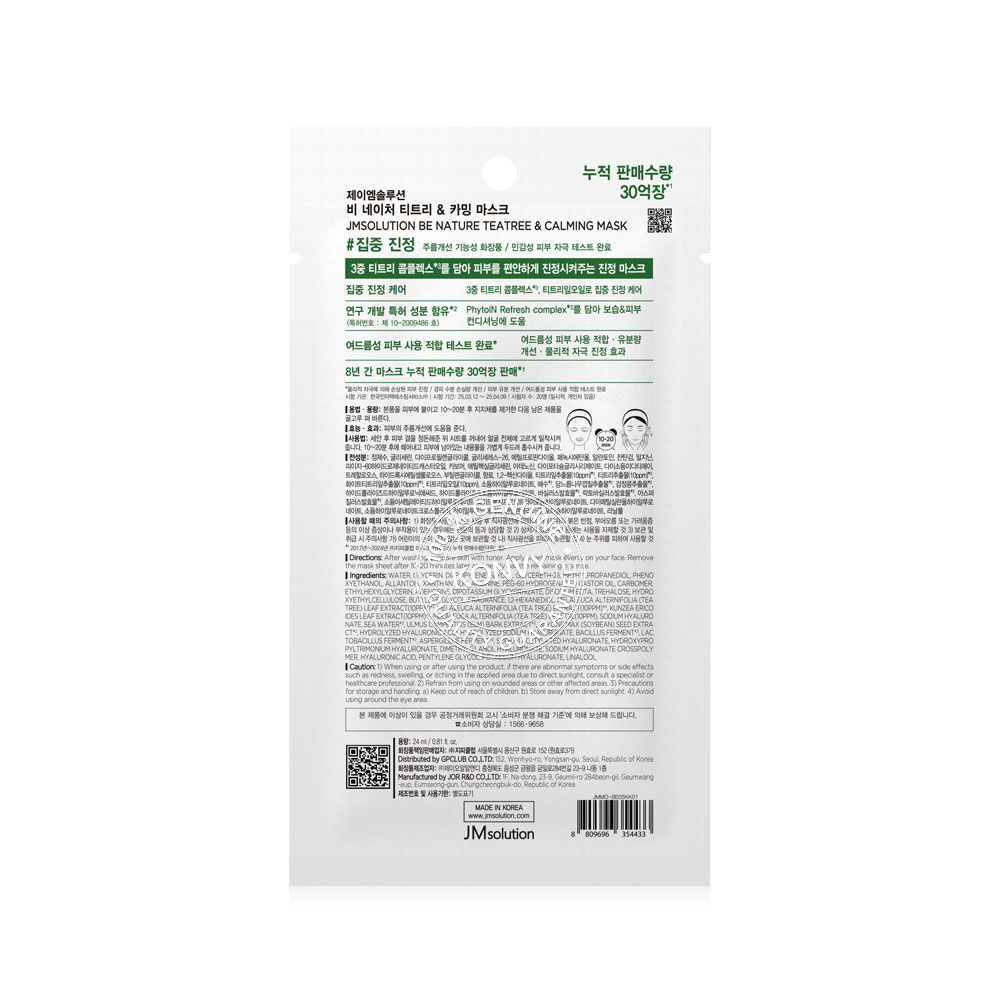 JM Solution Be Nature Teatree & Calming Mask 24ml แผ่นมาสก์หน้า อุดมด้วยสารสกัดจากทีทรี และน้ำมันใบทีทรี ช่วยควบคุมความมันส่วนเกิน ปลอบประโลมผิว และเติมความชุ่มชื้นให้ผิวยาวนาน