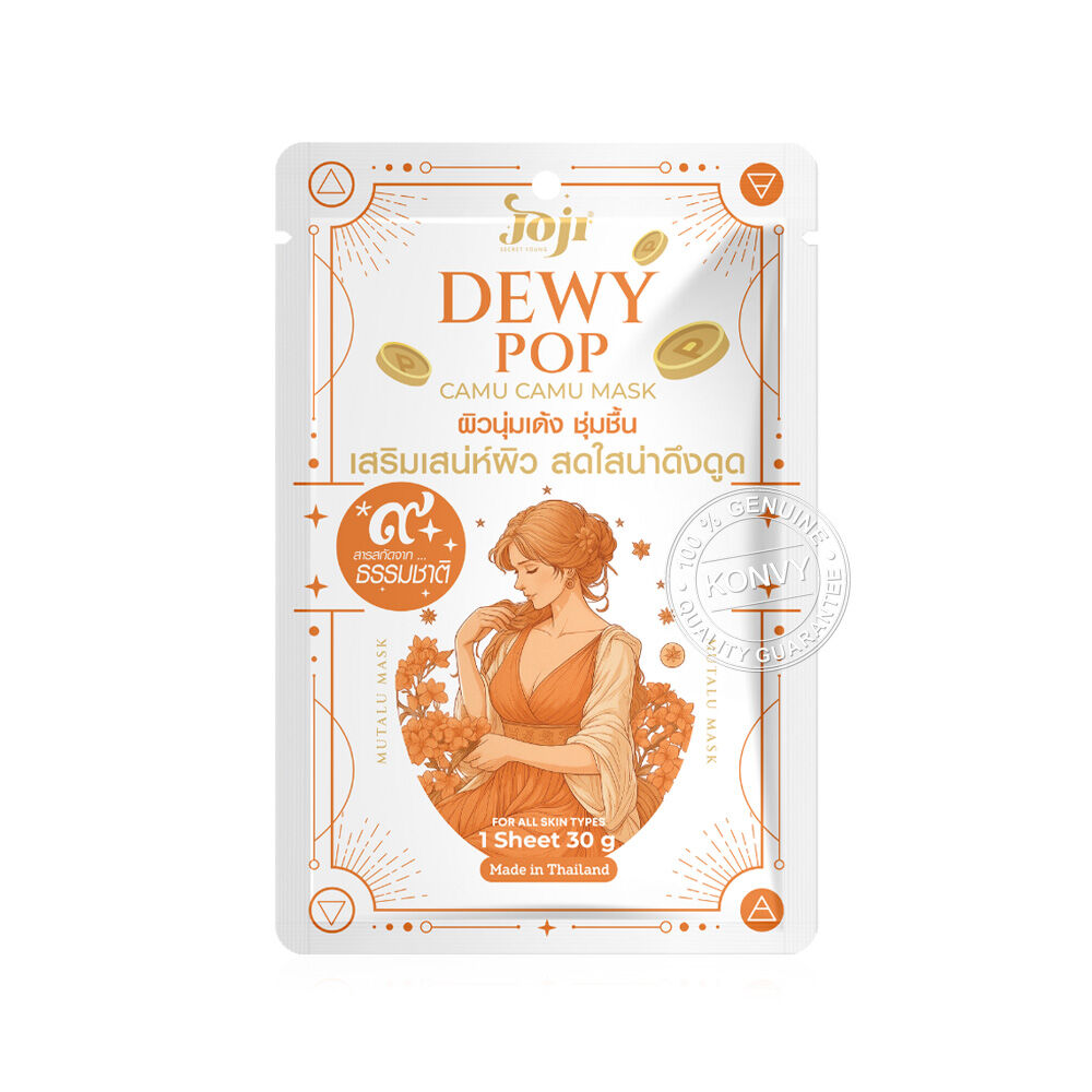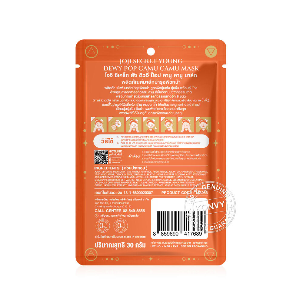 JOJI Secret Young Dewy Pop Camu Camu Mask 30g แผ่นมาสก์หน้า สูตรผิวนุ่มเด้ง ชุ่มชื้น พร้อมรับโชค ด้วยคุณค่าจากสารสกัดคามูคามู ที่เป็นวิตามินซีจากธรรมชาติ ผสานสารสกัดจากธรรมชาติอีก 8 ชนิด ช่วยฟื้นบำรุงผิวที่แห้งกร้าน หมองคล้ำ ให้กลับมาแลดูกระจ่างใสฉ่ำโกลว์ เนียนนุ่มชุ่มชื้น อิ่มน้ำ เผยผิวฉ่ำวาว โดดเด่นน่าดึงดูด