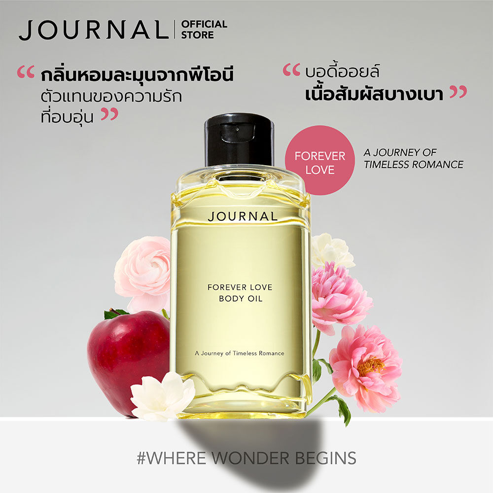 Journal Forever Love Body Oil 30ml บอดี้ออยล์ แนวกลิ่นฟลอรัล-ฟรุตตี้ ซึมซาบไว ไม่เหนียวเหนอะหนะ อุดมไปด้วยวิตามิน และสารสกัดจากน้ำมันธรรมชาติ ช่วยบำรุงผิวให้ดูเปล่งปลั่งสุขภาพดี พร้อมให้ความหอมอ่อนหวานจากดอกมะลิ เปรียบเสมือนความรักที่อบอุ่น และความหอมละมุนละไมจากดอกพีโอนี ที่เป็นสัญลักษณ์แห่งความรักที่บริสุทธิ์ ให้ความรู้สึกอบอุ่น อ่อนโยน และมั่นคง