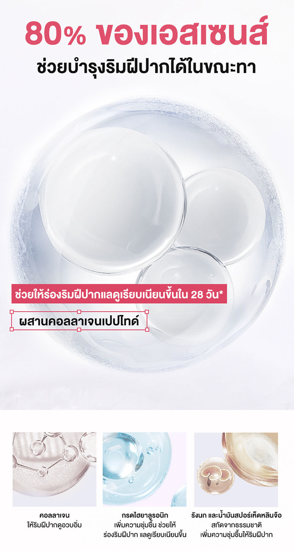 • มาพร้อมสารบำรุง ช่วยลดเลือนร่องริมฝีปากให้แลดูจางลง