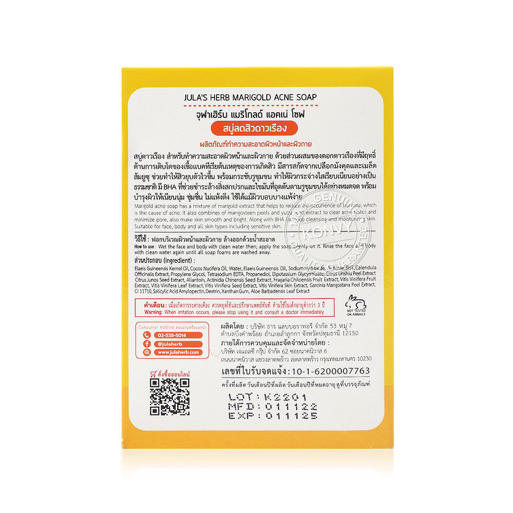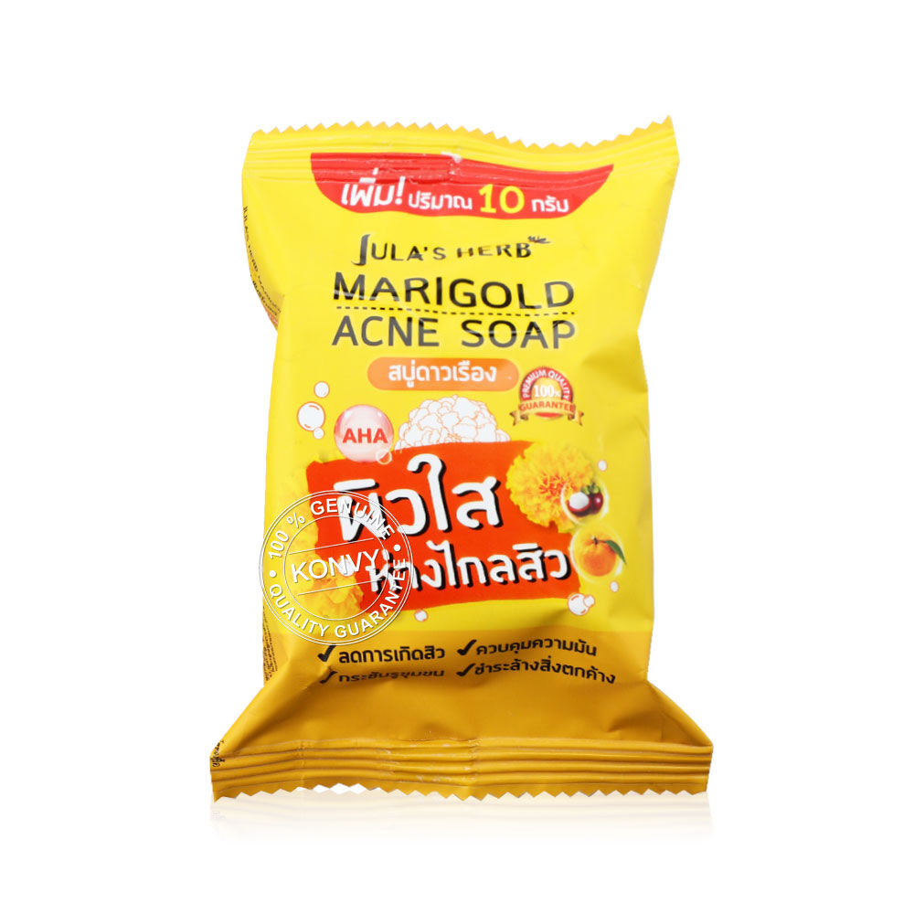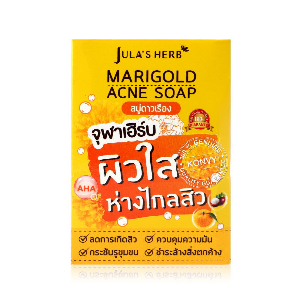 Julas Herb Marigold Acne Soap 70g สบู่ดาวเรือง มีสารสกัดจากดอกดาวเรือง และเปลือกมังคุด ช่วยทำความสะอาดสิ่งสกปรก และไขมันออกจากรูขุมขนได้ง่ายขึ้น ทำให้รูขุมขนสะอาดไม่อุดตัน และควบคุมความมัน ลดการอักเสบและการเกิดสิวใหม่ได้อย่างมีประสิทธิภาพ พร้อมช่วยผลัดเซลล์ผิวใหม่ได้อย่างอ่อนโยน เผยผิวกระจ่างใส และมีสารสกัดจากว่านหางจระเข้ที่ช่วยเพิ่มความชุ่มชื้นให้แก่ผิว โดยไม่ทำให้ผิวแห้งตึง