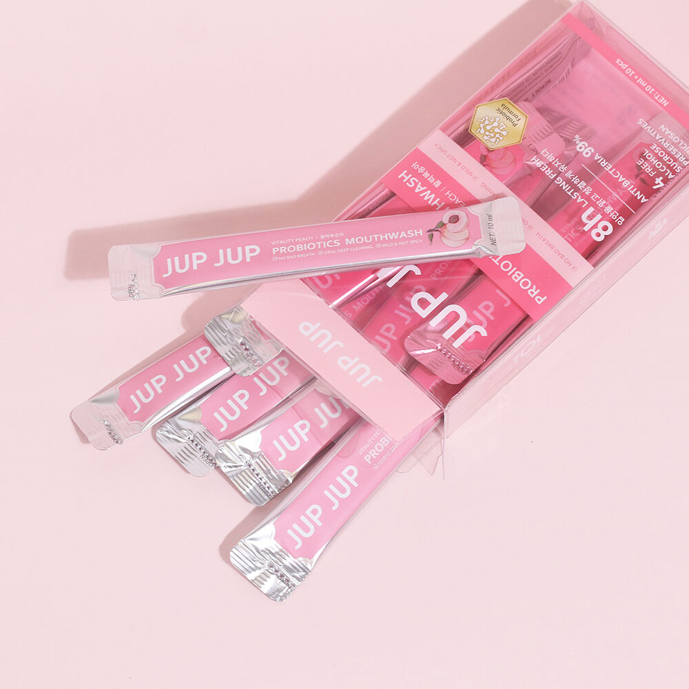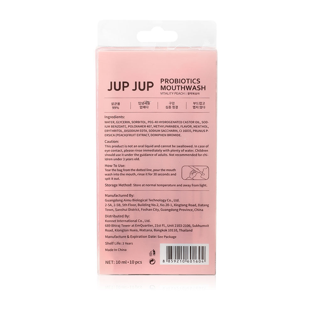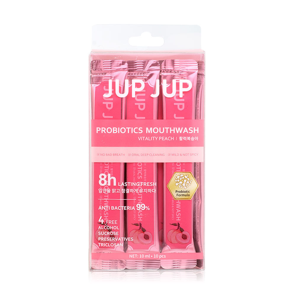 JUP JUP Probiotics Mouthwash [10ml x 10pcs] #Vitality Peach เพิ่มความมั่นใจระหว่างวันด้วยน้ำยาบ้วนปาก กลิ่นพีช 10ซอง สำหรับพกพา ช่วยทำความสะอาดช่องปาก ลดการสะสมของแบคทีเรีย 99.9% มอบลมหายใจหอมสดชื่นยาวนาน 8 ชั่วโมง