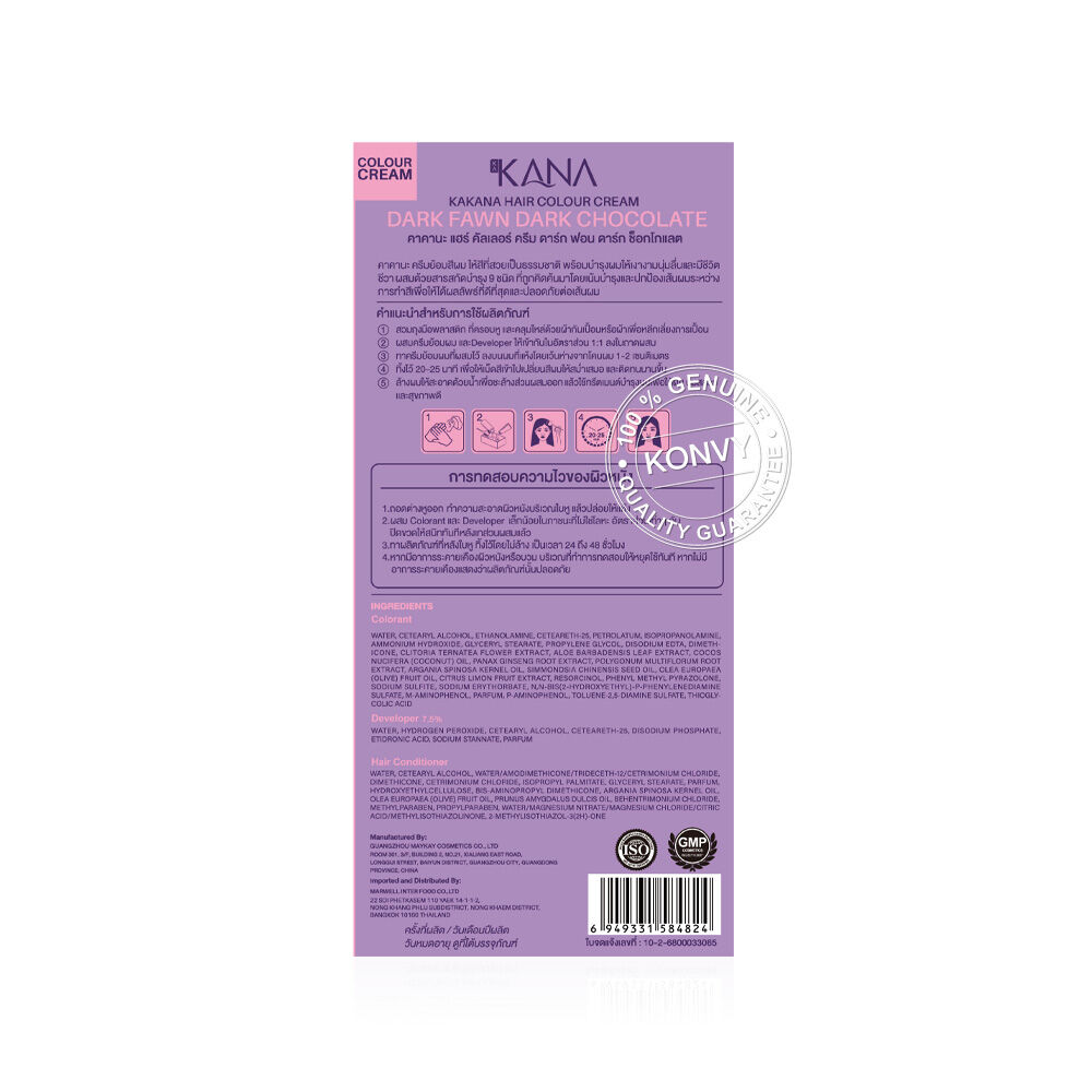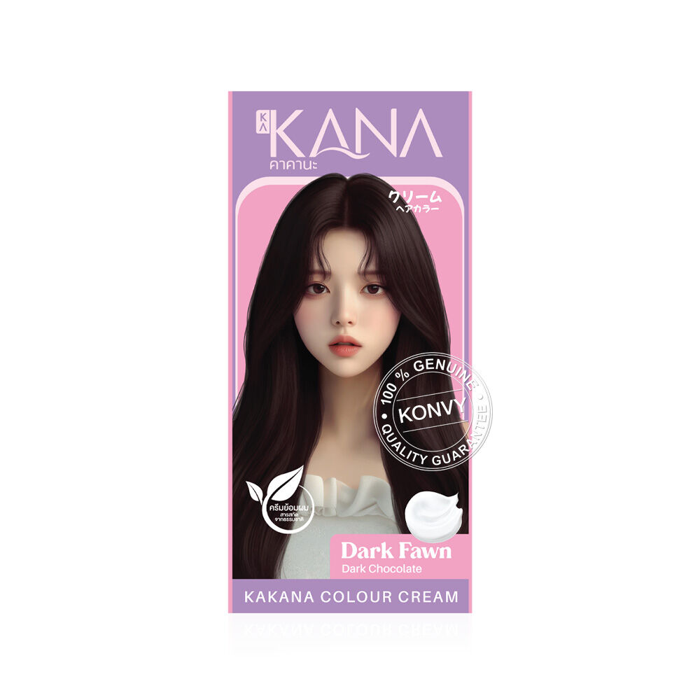 KAKANA Hair Colour Cream 200ml #Dark Fawn Dark Chocolate ครีมย้อมสีผม สูตรไม่มีแอมโมเนีย อ่อนโยนต่อเส้นผมและหนังศีรษะ ไม่ฉุนแสบจมูก ผสานด้วยคุณค่าจากสารสกัดธรรมชาติ 9 ชนิด (กุหลาบ, ดอกอัญชัน, น้ำมันโจโจบา, ว่านหางจระเข้, น้ำมันมะพร้าว, น้ำมันอาร์แกน, น้ำมันมะกอก, กรดอัลฟาไฮดรอกซี และโชวู) ช่วยบำรุงเส้นผมระหว่างทำสี ให้หลังย้อมผมไม่แห้งกร้าน ดูนุ่มสลวย เงางาม สุขภาพดี