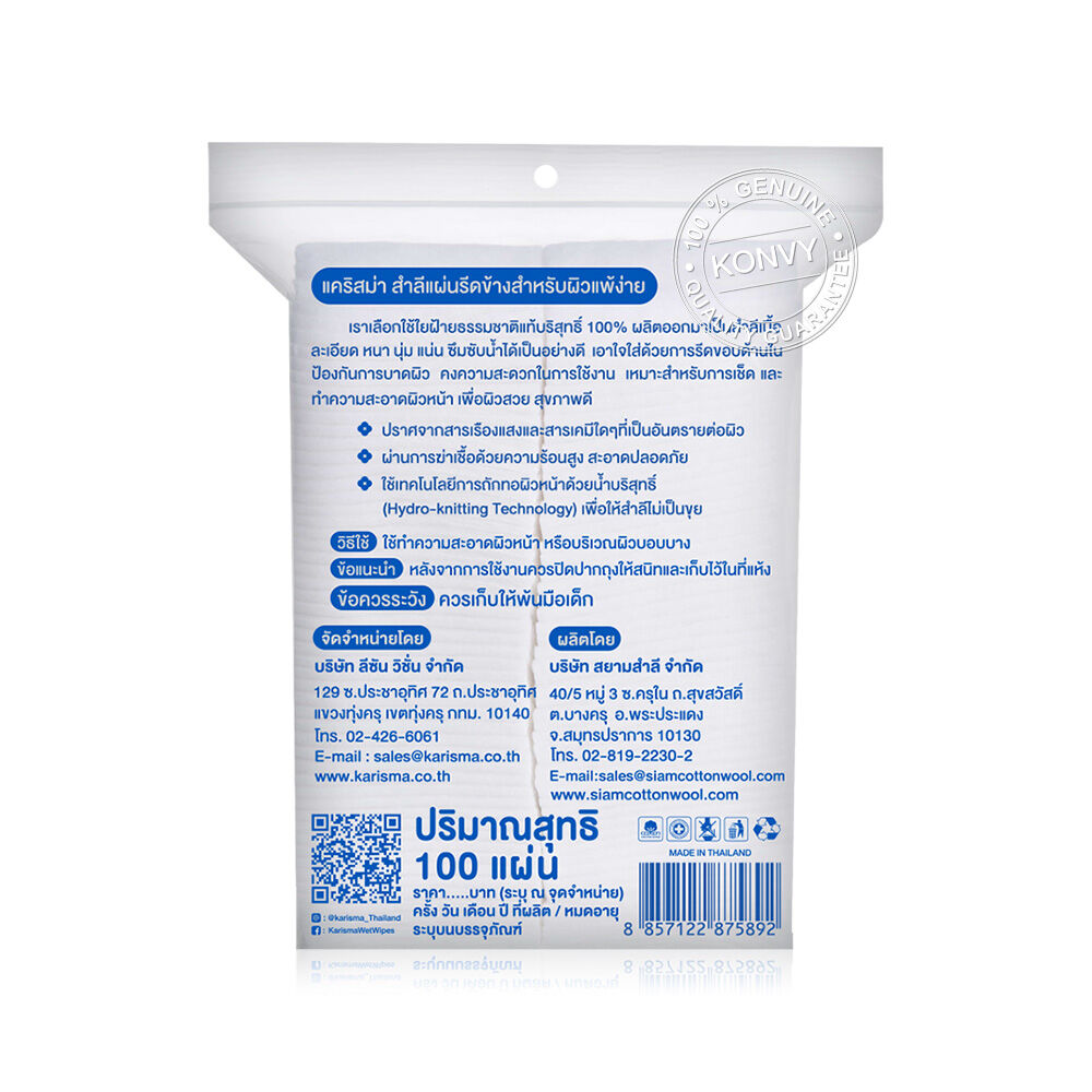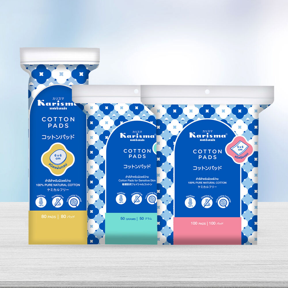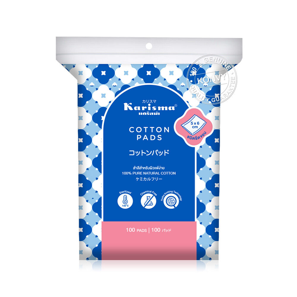 Karisma Cotton Pads Compressed Edge [100 Pads x 4pcs] สำลีแผ่นรีดข้างหรือสำลีแผ่นรีดขอบ ออกแบบมาเพื่อผู้หญิงโดยเฉพาะ สำลีรีดขอบด้านใน ขอบสำลีไม่บาดผิวหน้า ผลิตจากฝ้ายแท้บริสุทธิ์ พัฒนาเป็นพิเศษเพื่อไม่ให้ทิ้งเศษหลงเหลือหลังการใช้ เนื้อสำลีหนานุ่มลดการเสียดสี ให้ส้มผัสอ่อนละมุน ซึมซับดีเยี่ยม ปราศจากสารเคมีตกค้างและสารเรืองแสง ผ่านการสเตอริไรซ์ด้วยความร้อนสูงจึงสะอาดปลอดภัย