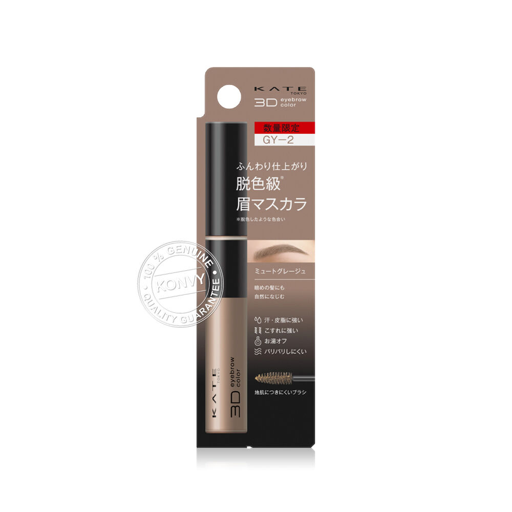 KATE 3D Eyebrow Color Z 6.3g #GY-2 มาสคาร่าคิ้ว รุ่นลิมิเต็ดอิดิชัน เม็ดสีชัด เนื้อลิควิดบางเบา กันเหงื่อ ไม่ไหลเยิ้มระหว่างวัน ช่วยปรับระดับสีคิ้วที่เข้มให้มีความละมุน แลดูเป็นธรรมชาติ และล็อคขนคิ้วให้ตั้งฟูสวย มาพร้อมหัวแปรงเล็ก ทำให้สามารถปัดคิ้วได้ง่าย