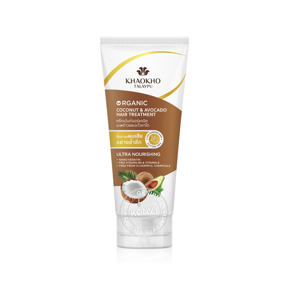 Khaokho Talaypu Treatment Coconut & Avocado 185ml ทรีทเมนต์มะพร้าวและอะโวคาโด ฟื้นบำรุงผมแห้งเสีย แตกปลาย ขาดความชุ่มชื้น จากความร้อนและสารเคมี ด้วยส่วนผสมจากธรรมชาติ เพื่อผมนุ่ม ชุ่มชื้น มีน้ำหนัก เปล่งประกายเงางามจากโคนจรดปลาย