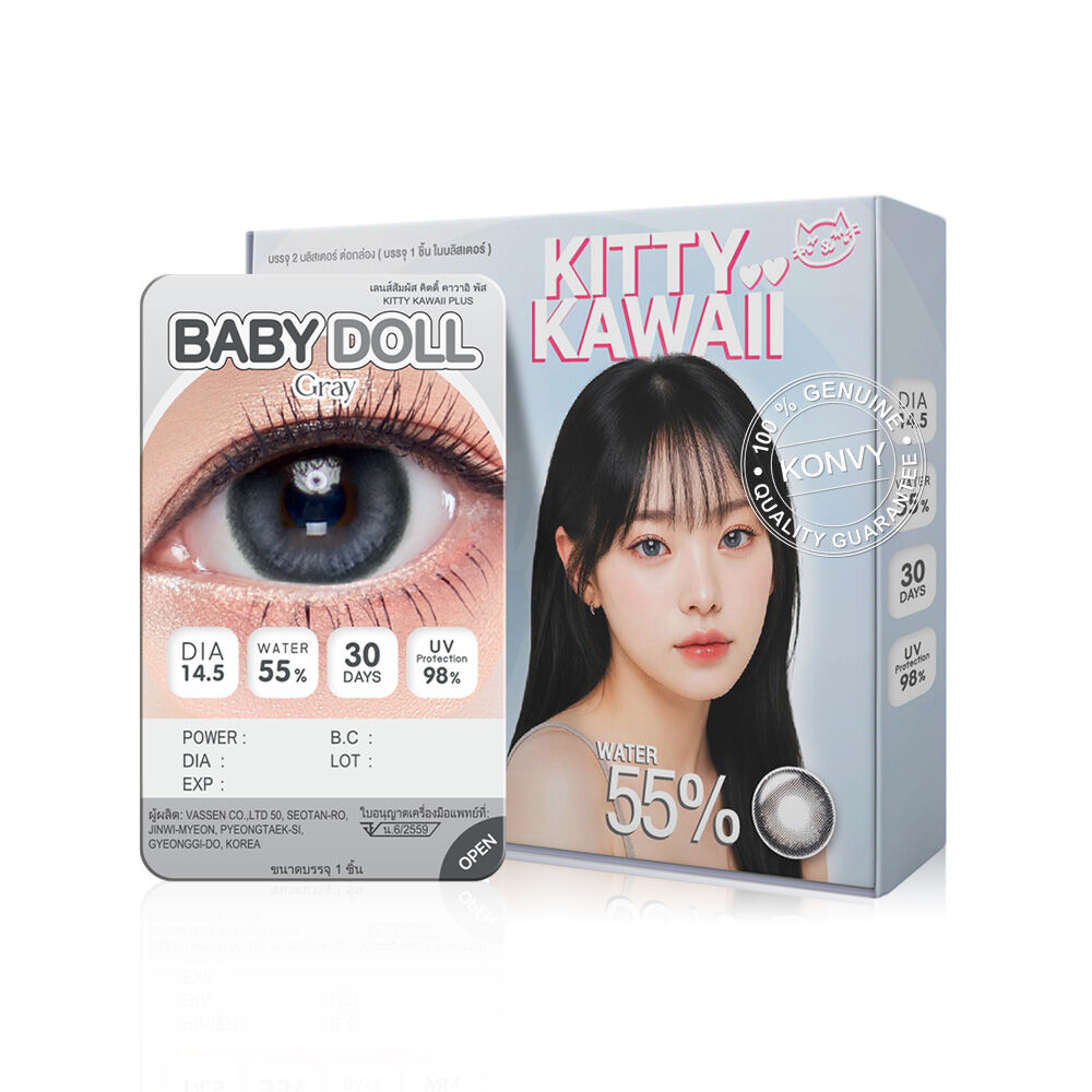 Kitty Kawaii Plus Contact Lens Baby Doll Gray [1Pair] #-6.00 คอนแทคเลนส์แบบรายเดือนรุ่น Baby Doll โทนสีเทา ไล่เลเยอร์แบบ Gradient เบลนด์เข้ากับดวงตาอย่างเป็นธรรมชาติ ขอบเข้มช่วยคอนทัวร์ตาให้กลมโตคมชัด แต่ยังคงลุคซอฟต์หวาน เหมือนใส่ฟิลเตอร์ให้กับดวงตา วัสดุ Soft Lens เลนส์ถนอมสายตา บางเบา ใส่สบายตา 19 ชม. พร้อม UV Protection ปกป้องดวงตาจากรังสี UVA และ UVB