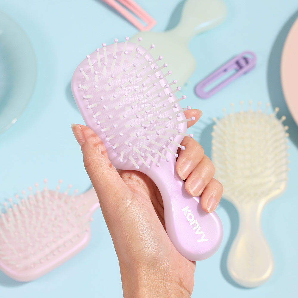 Konvy Mini Air Cushion Hair Comb 1pc #Purple แปรงหวีผมไซส์มินิ สีม่วง ผลิตจากวัสดุคุณภาพดี ถูกออกแบบให้มีรูระบายอากาศ ช่วยให้ผมแห้งเร็วขึ้น ขนแปรงอ่อนนุ่มช่วยหวีผมได้อย่างนุ่มนวล และทำให้ผมไม่พันกัน ใช้งานง่าย พกพาสะดวก