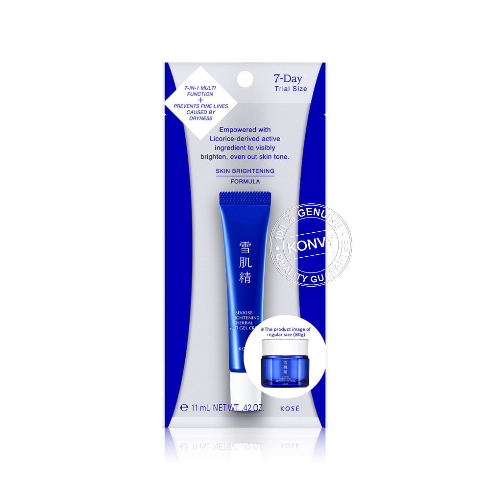 KOSE Sekkisei Brightening Herbal Multi Gel Cream 11ml ครีมบำรุงผิวหน้าเนื้อเจล สบายผิว อุดมด้วยคุณค่าของ W-Stearyl Glycyrrhetinate จากชะเอมเทศ ที่เป็นเอกสิทธิ์เฉพาะของ KOSE ช่วยปรับผิวให้เรียบเนียน แลดูกระจ่างใส ผสานสารสกัดลูกเดือยเข้มข้นจากญี่ปุ่น และส่วนผสมจากธรรมชาติ 86% ช่วยดูแลปัญหาผิวหมองคล้ำ และเติมความชุ่มชื้นยาวนาน เผยผิวเนียนนุ่ม อิ่มน้ำ ดูเปล่งปลั่ง สุขภาพดี