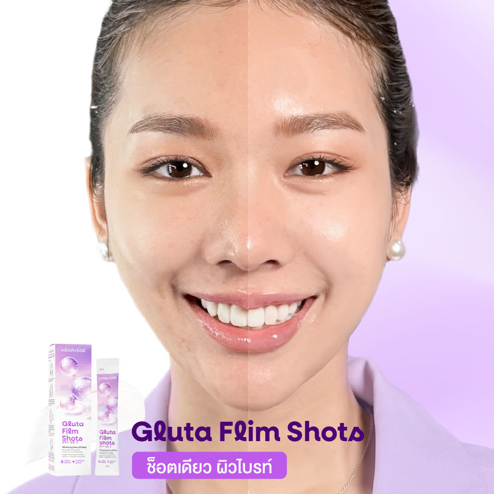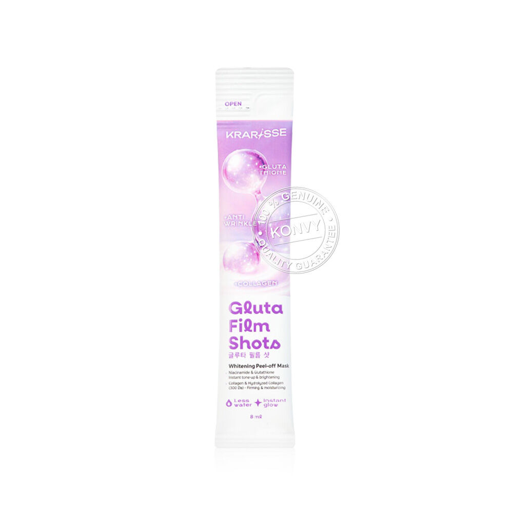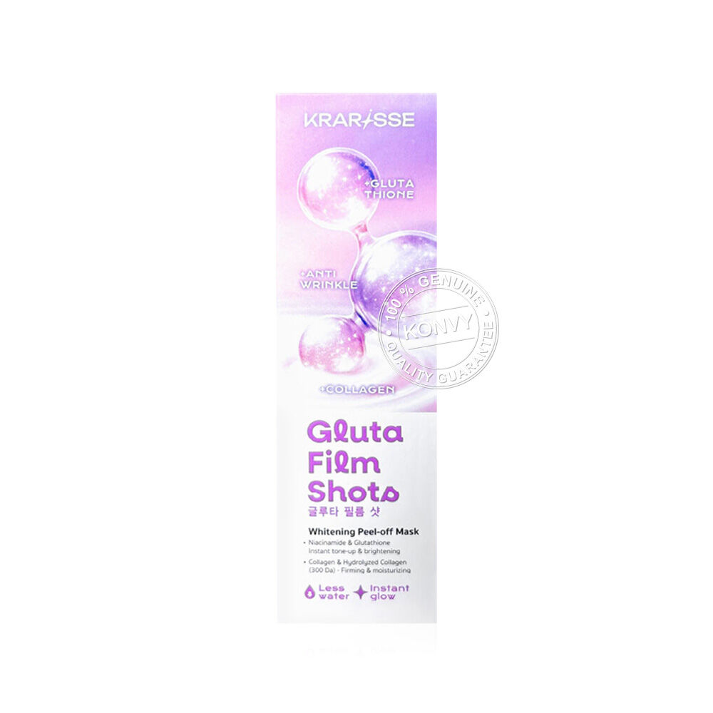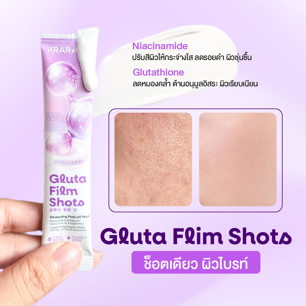 Krarisse Gluta Film Shots 40ml มาสก์ชนิดลอกไม่ต้องล้าง สูตรกลูต้า เนื้อสัมผัสครีม เปลี่ยนเป็นฟิล์มใส ด้วยนวัตกรรมสกินแคร์เข้มข้น ผสาน Niacinamide และ Glutathione เข้มข้น ช่วยปรับสีผิวให้สม่ำเสมอ แลดูกระจ่างใสขึ้น พร้อมด้วย Collagen & Hydrolyzed Collagen ช่วยเติมความชุ่มชื้นให้ผิวอย่างล้ำลึก ยกกระชับผิวหน้า และให้ริ้วรอยแลดูตื้นขึ้น เผยผิวเนียนไบร์ท มั่นใจพร้อมลุยในทุกสถานการณ์