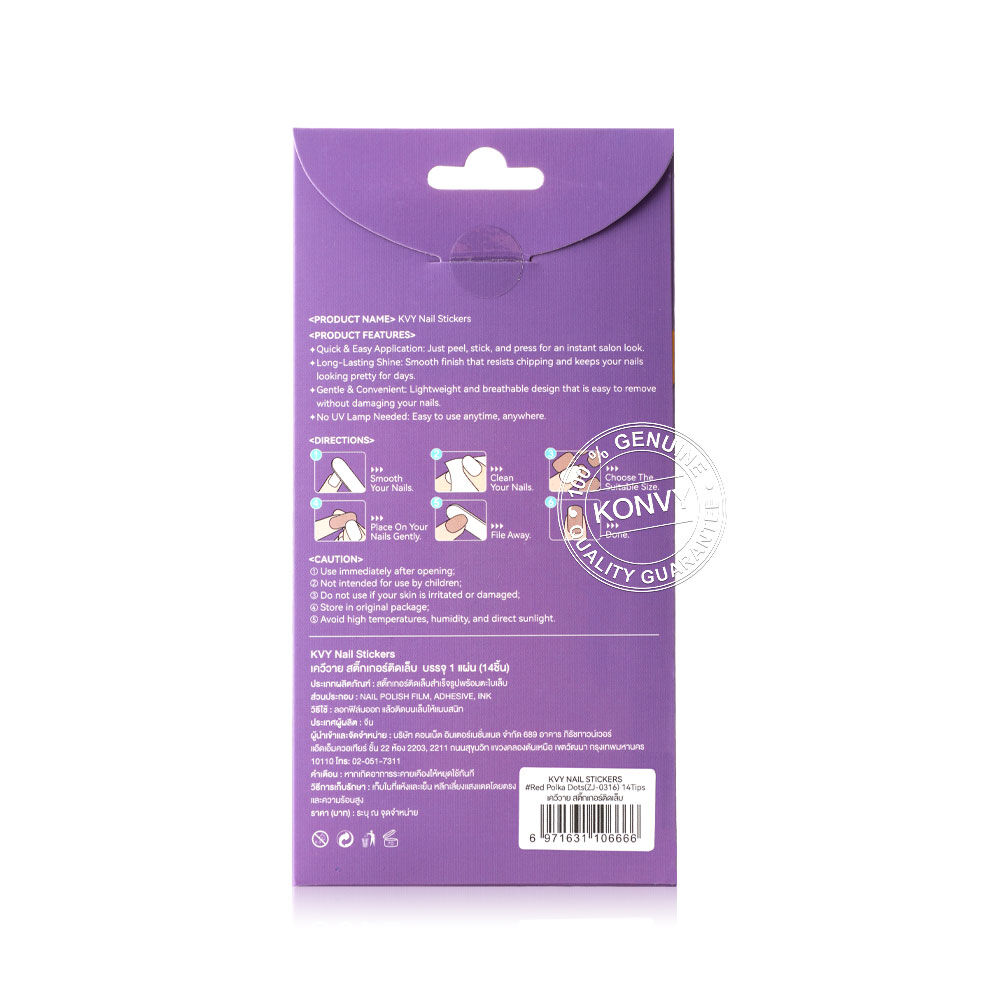 KVY Nail Stickers 14Tips #ZJ-0316 Red Polka Dots สติกเกอร์ติดเล็บ ลาย Red Polka Dots ติดง่าย แห้งไว เงางาม ทนทาน โดยไม่ต้องใช้น้ำยาเคลือบหรือเครื่องอบ UV Lamp ให้คุณคอมพลีทเล็บสวยระดับซาลอนได้อย่างรวดเร็วและง่ายดายด้วยตัวเอง พร้อมสร้างลุคแฟชั่นที่สะดุดตาและมีสไตล์ได้ทุกวัน