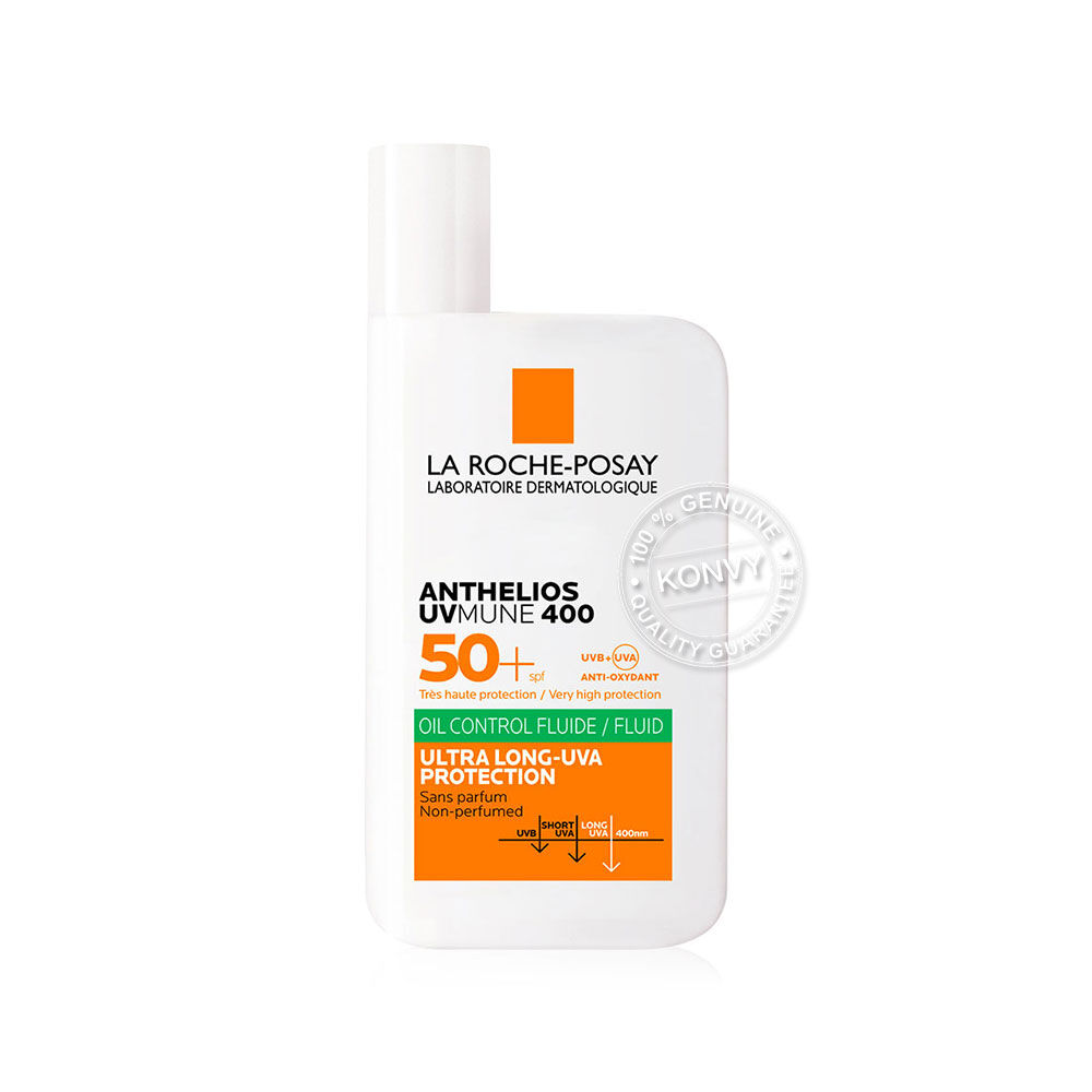 La Roche Posay Anthelios UVMUNE400 Oil Control Fluid SPF50+ PA++++ 50ml กันแดดประสิทธิภาพการปกป้องสูง ครอบคลุมที่สุด มาพร้อมเนื้อฟลูอิดและ Mexoryl 400 เทคโนโลยีล่าสุดของลาโรช โพเซย์ ที่ให้การปกป้องได้เหนือกว่า พร้อมค่าปกป้อง SPF50+ และ PA++++ สามารถปกป้องผิวจาก UVA/UVB รวมถึง Ultra-Long UVA ที่มีช่วงความยาวคลื่น 380 ถึง 400 นาโนเมตร ซึ่งอันตรายกว่าและสามารถทำร้ายผิวหนังได้ลึก พร้อมปกป้องผิวจากอินฟราเรด ฝุ่น และมลภาวะ ผสาน AIRLICIUM™ ช่วยลดและดูดซับความมันส่วนเกิน ให้เนื้อสุดบางเบา เกลี่ยง่าย ไม่ทิ้งคราบขาว สัมผัสสบายผิว ไม่เหนอะหนะ