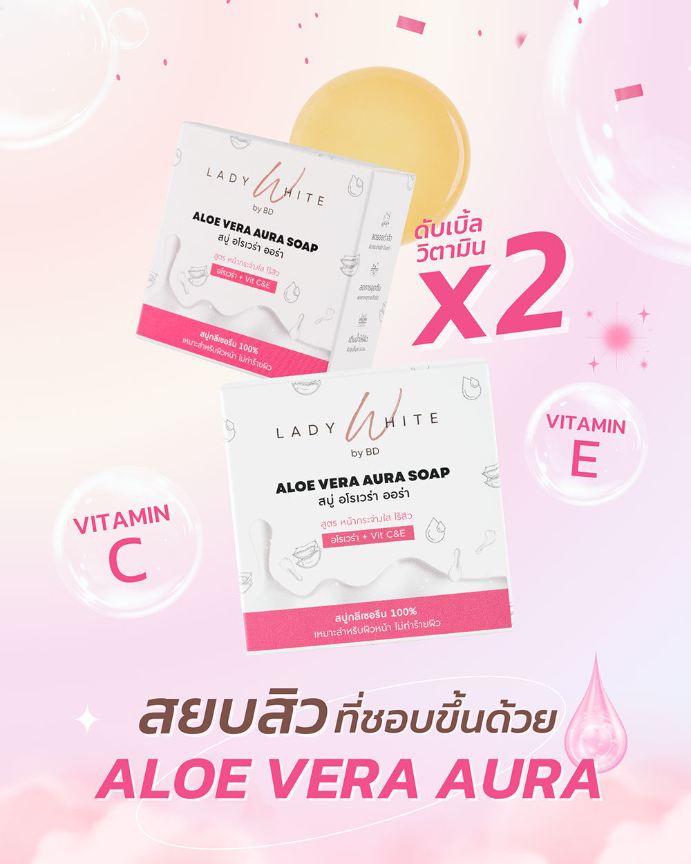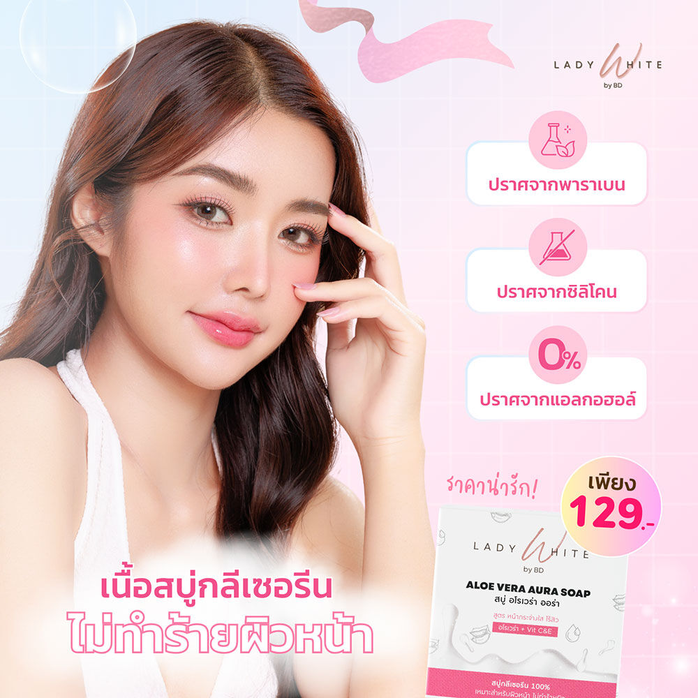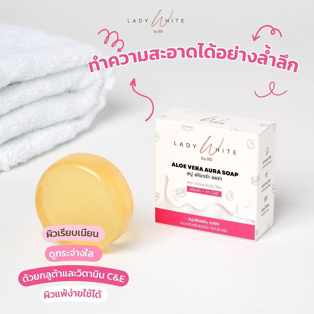 Lady White Aloe Vera Aura C&E Acne Soap [70g x 2pcs] ผลิตภัณฑ์ทำความสะอาดผิวหน้า พร้อมบำรุงในขั้นตอนเดียว สำหรับผิวมัน เป็นสิวง่าย ช่วยดูแลปัญหาสิวซ้ำซาก และช่วยลดรอยสิวให้ดูจางลง พร้อมช่วยให้ผิวกระจ่างใส ทำความสะอาดผิวอย่างอ่อนโยนแม้ผิวแพ้ง่าย ไม่ทำให้ผิวระคายเคืองและแห้งตึง
