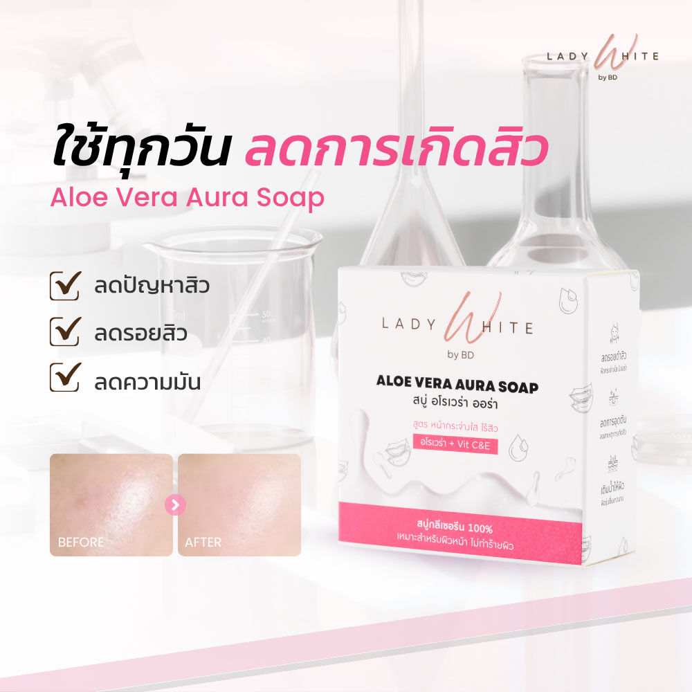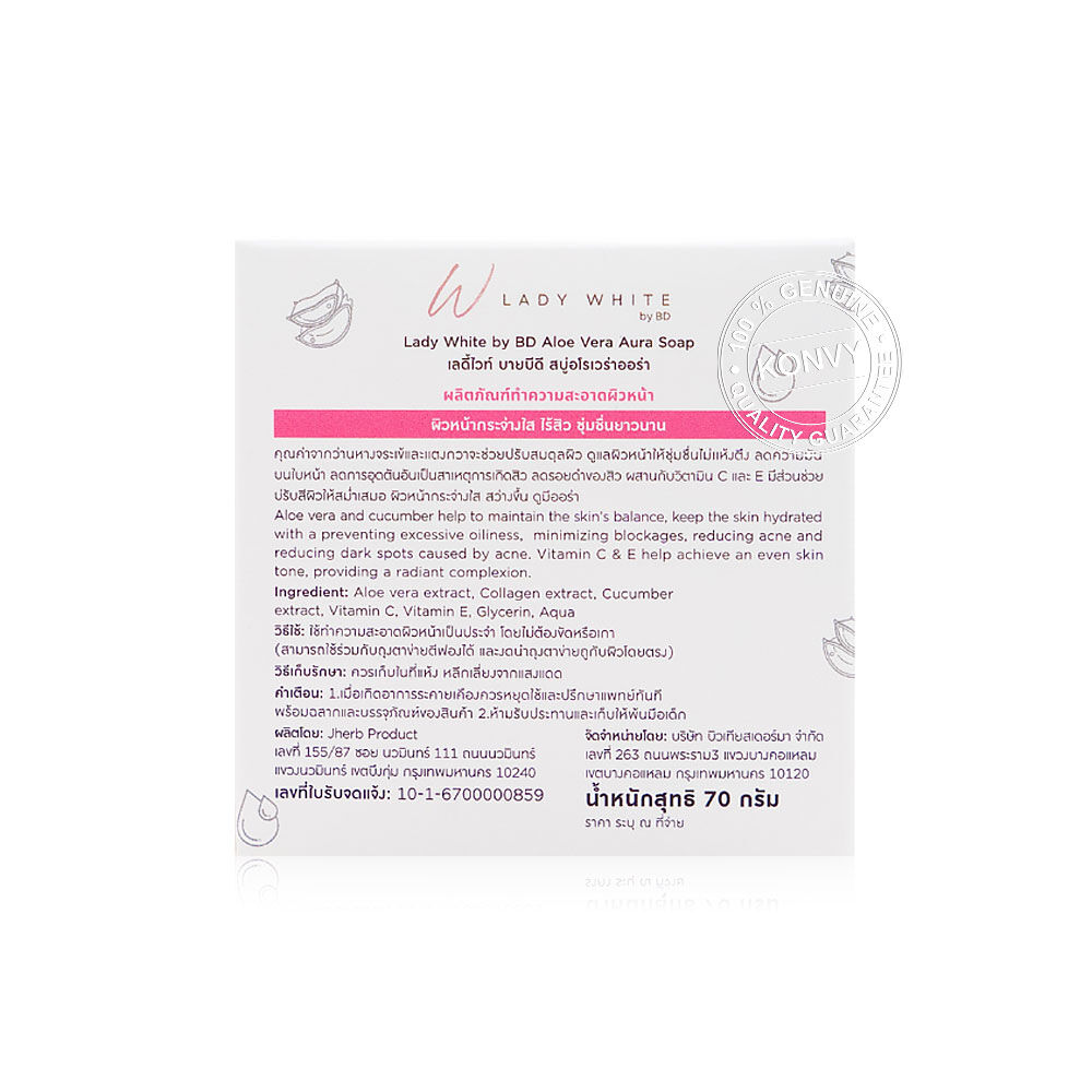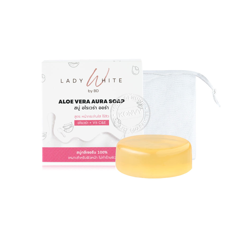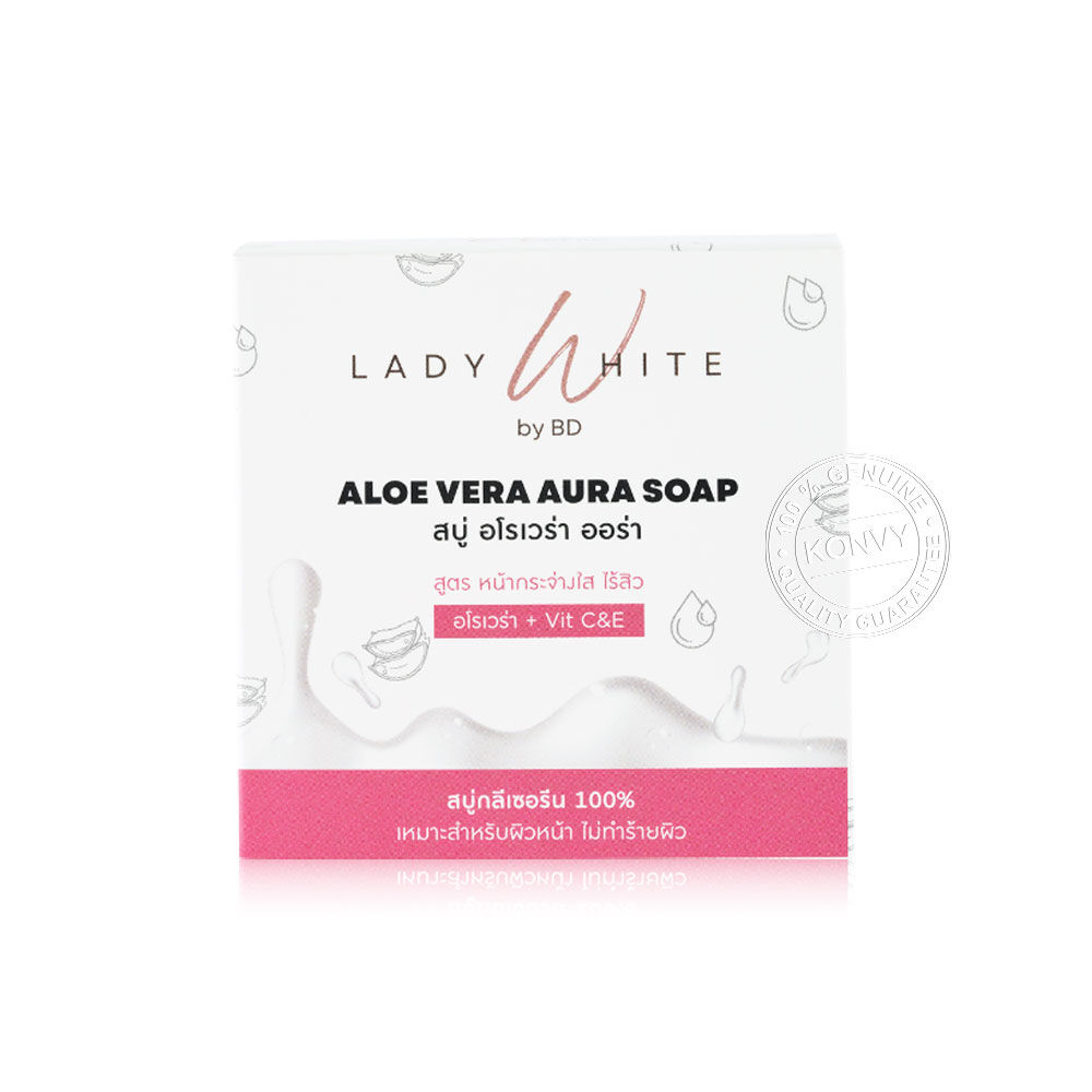 Lady White Aloe Vera Aura C&E Acne Soap 70g สบู่ล้างหน้า เนื้อสบู่กลีเซอรีน ช่วยทำความสะอาดสิ่งสกปรก ความมันส่วนเกิน และเมคอัพที่เช็ดออกไม่หมด ผสานวิตามินซี และวิตามินอี ช่วยลดรอยดำสิว และจุดด่างดำ ให้ผิวหน้ากระจ่างสว่างใสขึ้น ปรับสีผิวให้สม่ำเสมอ ดูเรียบเนียน พร้อมคุณค่าจากอโรเวร่า และแตงกวาช่วยปรับสมดุลผิว ดูแลผิวหน้าให้ชุ่มชื้นไม่แห้งตึง ลดความมันส่วนเกินบนใบหน้า ลดการอุดตัน ลดการเกิดสิว และสิวผด