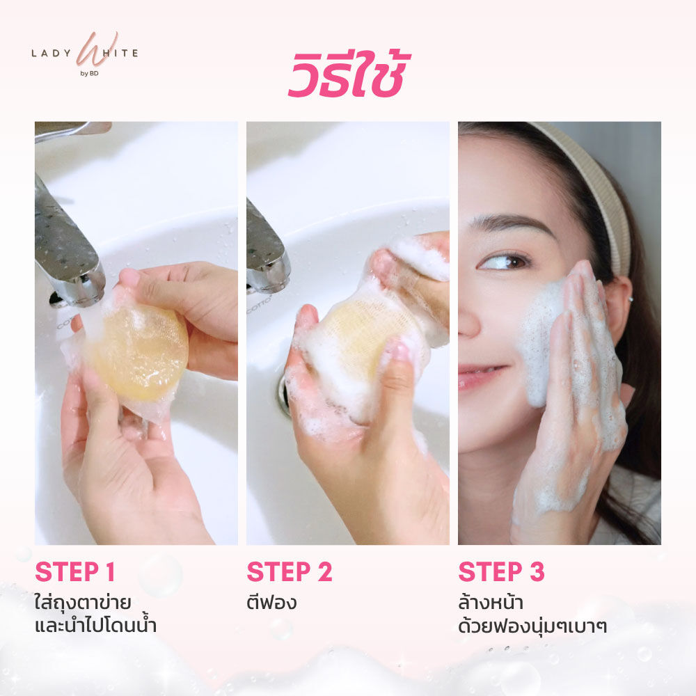 • สัมผัสฟองนุ่ม สบายผิว ด้วยถุงตาข่ายตีฟอง