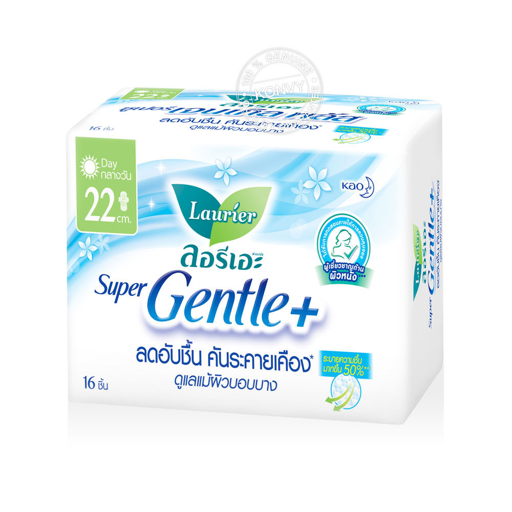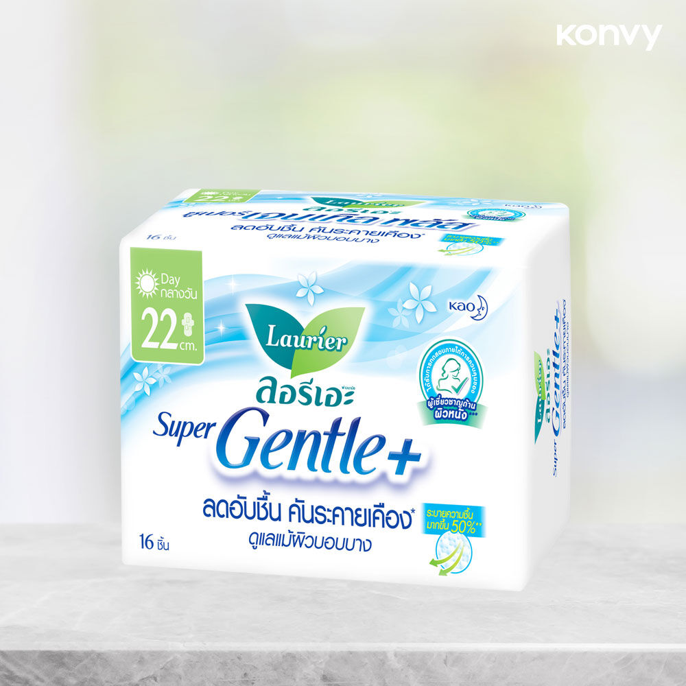 LAURIER ผ้าอนามัย Super Gentle Plus [22cm x 16pcs] ผ้าอนามัยแบบมีปีก ความยาว 22 ซม. ผิวหน้านุ่มพิเศษ วันมาปกติ-มามาก สำหรับกลางวัน ลดอับชื้น คันระคายเคือง ดูแลแม้ผิวบอบบาง นวัตกรรมใหม่ผิวหน้าเจนเทิลพลัส และได้รับการทดสอบภายใต้การควบคุมของผู้เชียวชาญด้านผิวหนัง