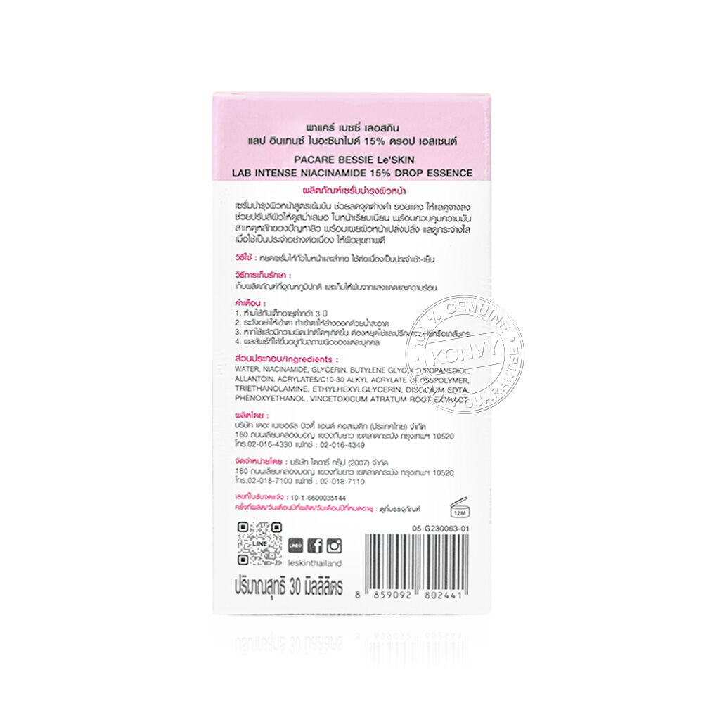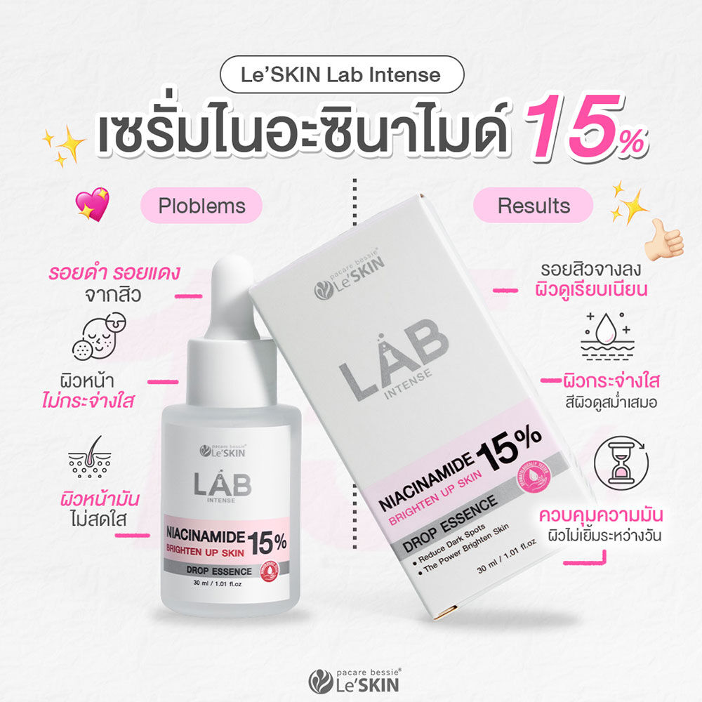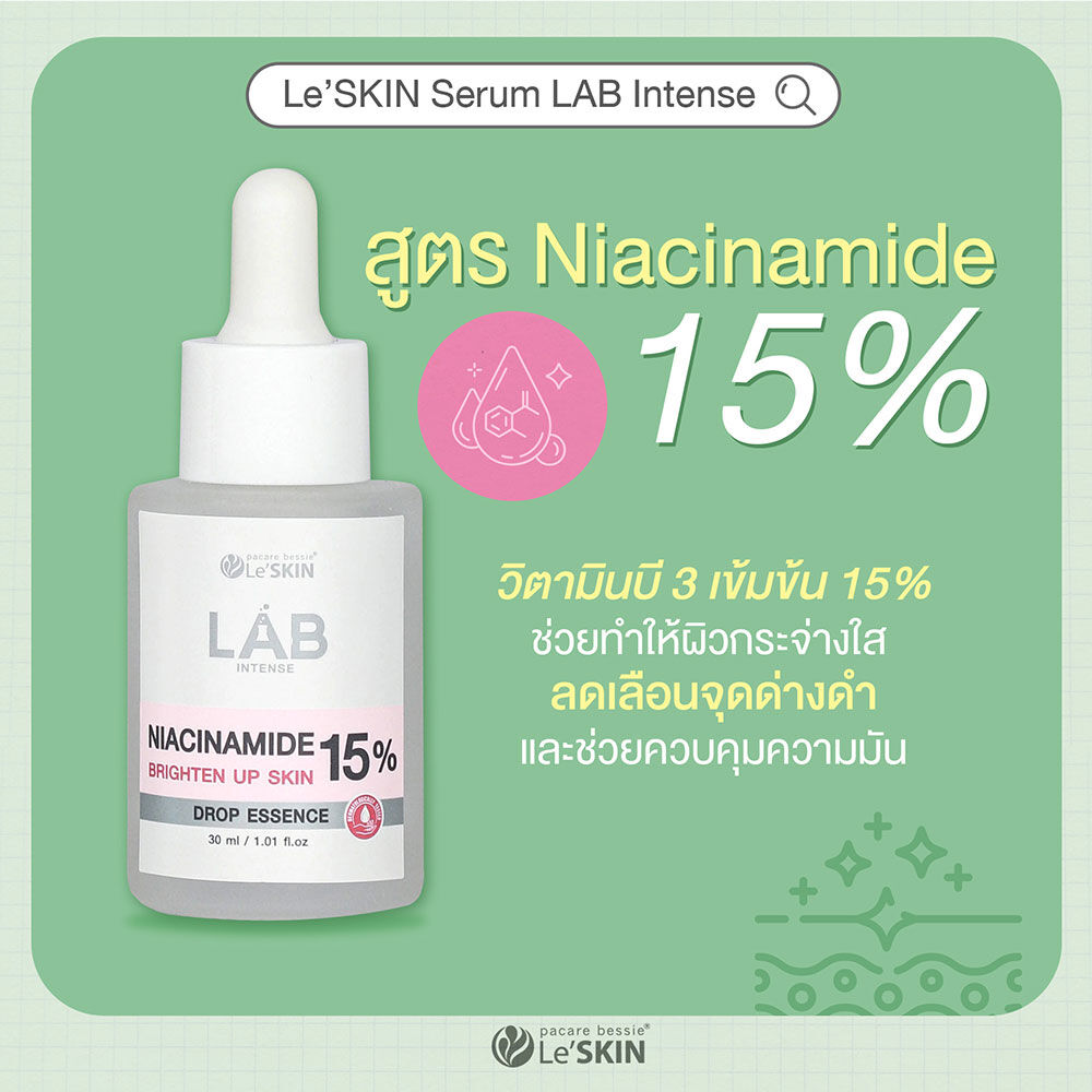 Le'SKIN Lab Intense Niacinamide 15% Drop Essence 30ml เซรั่มบำรุงผิวหน้าสูตรเข้มข้น ช่วยลดจุดด่างดำ รอยแดงให้แลดูจางลง พร้อมปรับสีผิวให้ดูเรียบเนียนสม่ำเสมอ และควบคุมความมัน สาเหตุหลักของปัญหาสิว เผยผิวเปล่งปลั่ง แลดูกระจ่างใส สุขภาพดี