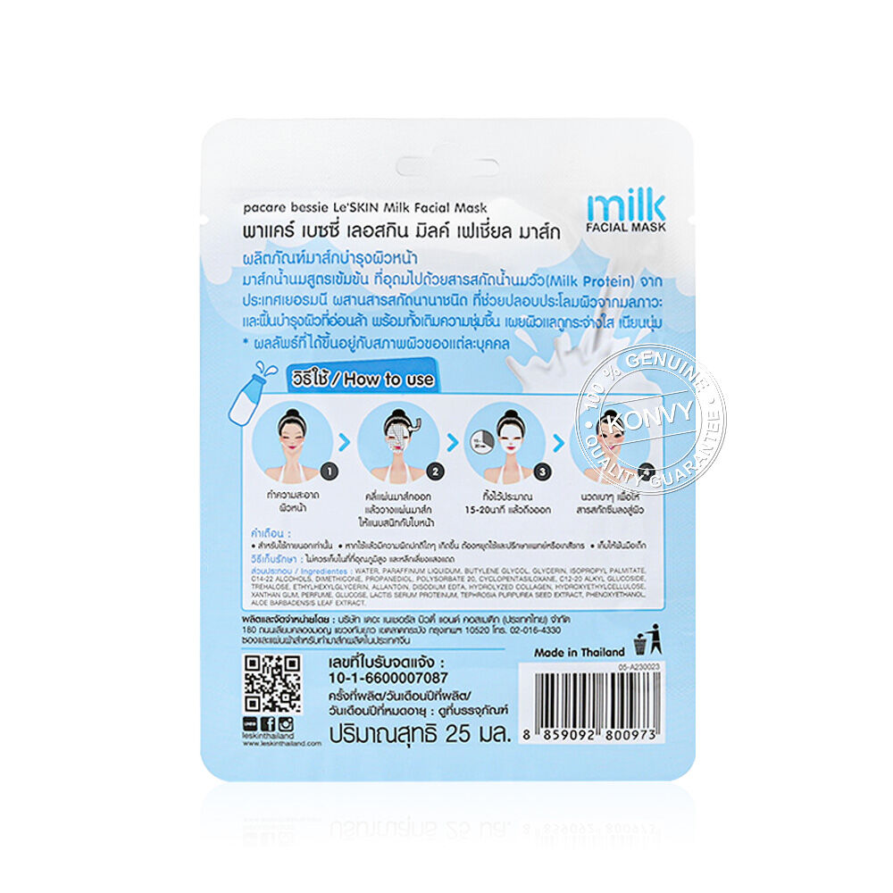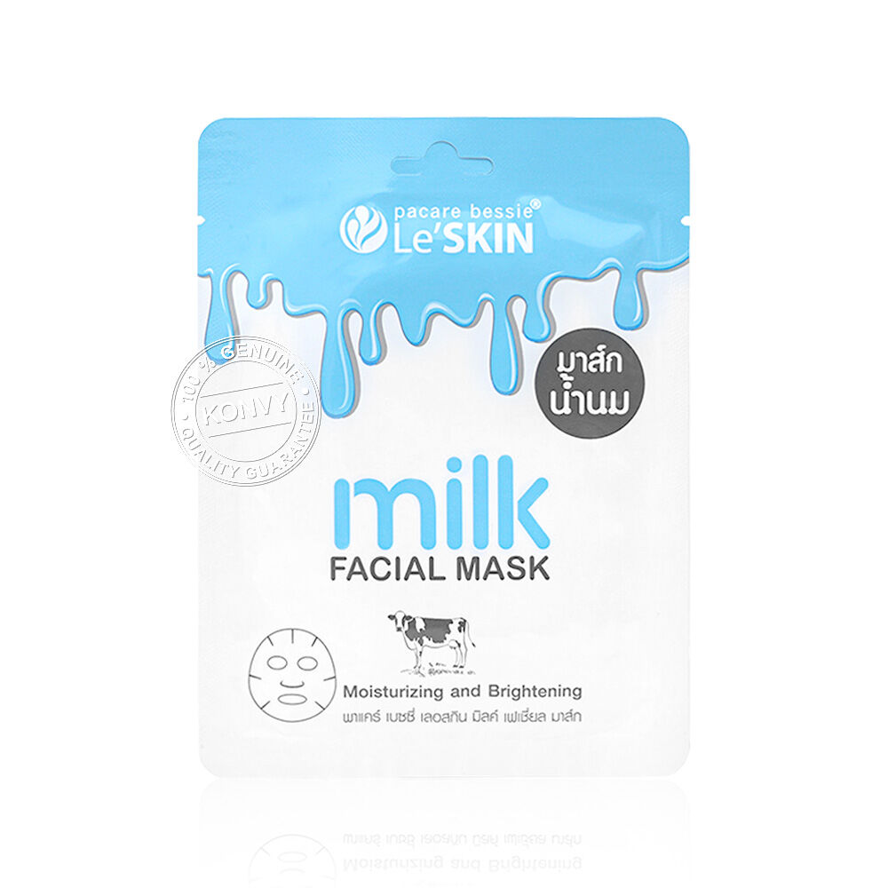 Le'SKIN Milk Facial Mask 25ml มาสก์น้ำนมสูตรเข้มข้น ที่อุดมไปด้วยสารสกัดน้ำนมวัว (Milk Protein) จากประเทศเยอรมัน ผสานสารสกัดนานาชนิด ที่ช่วยปลอบประโลมผิวจากมลภาวะ และฟื้นบำรุงผิวที่อ่อนล้า พร้อมทั้งเติมความชุ่มชื้น เผยผิวแลดูกระจ่างใส เนียนนุ่ม