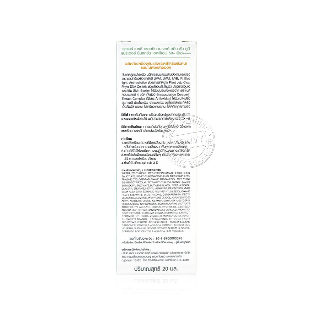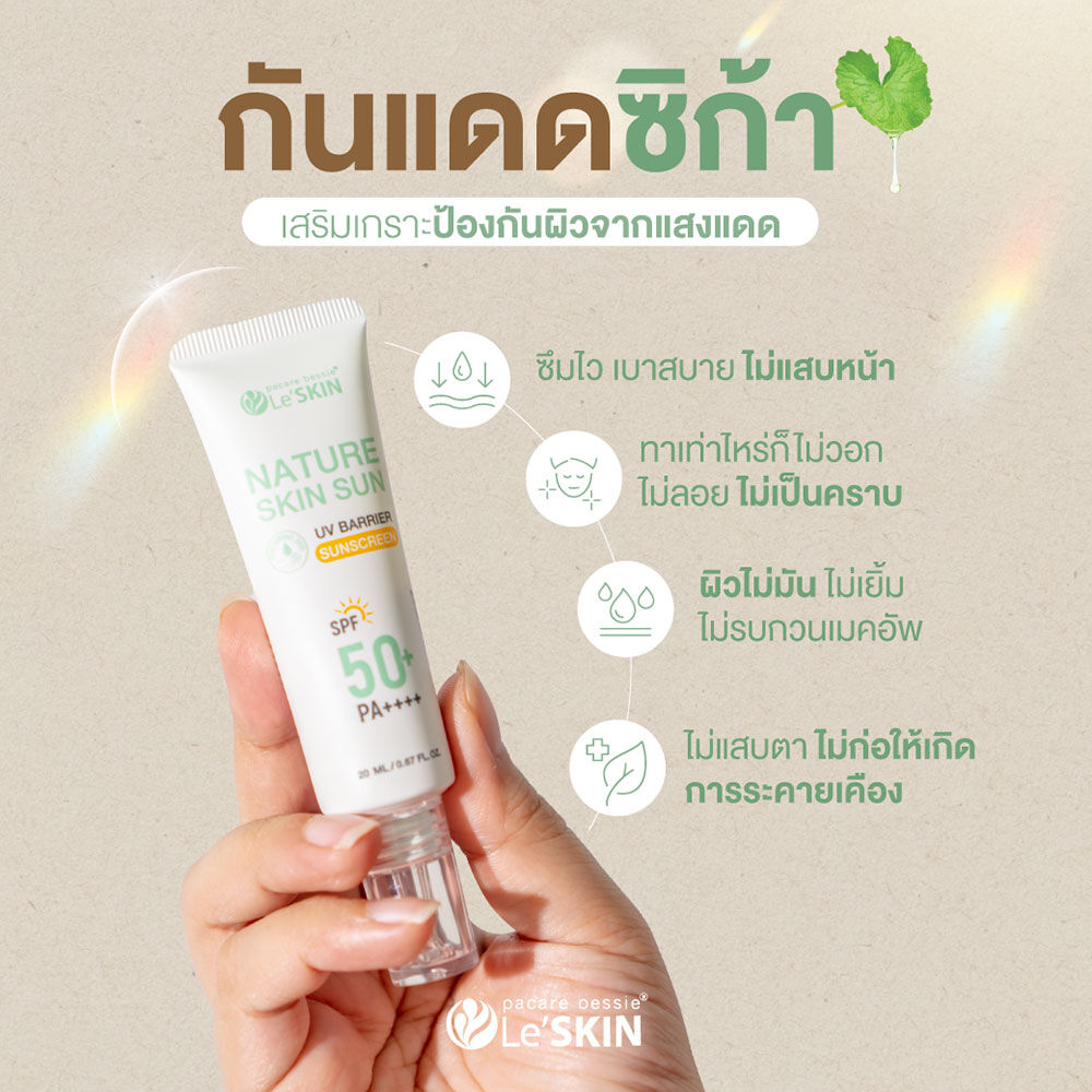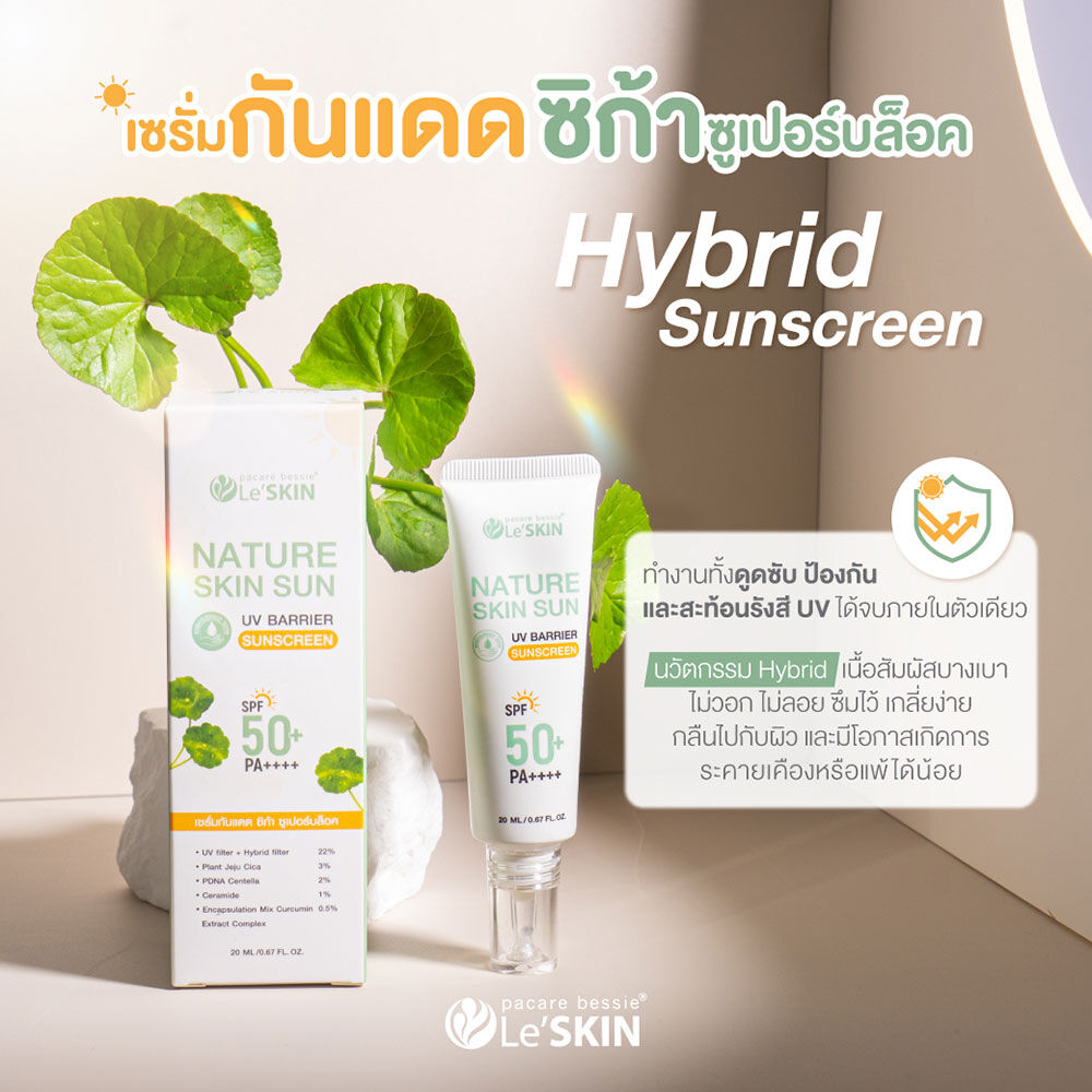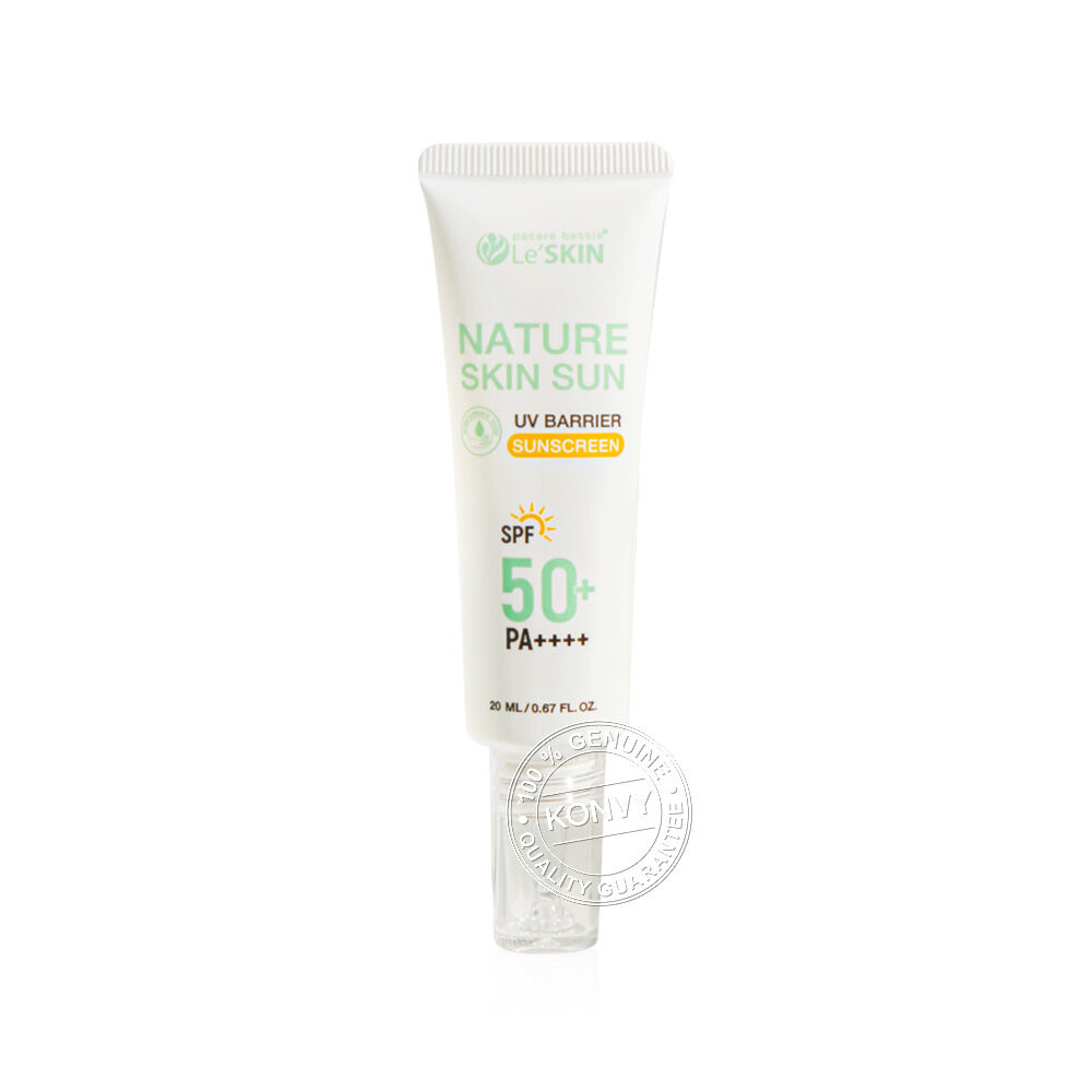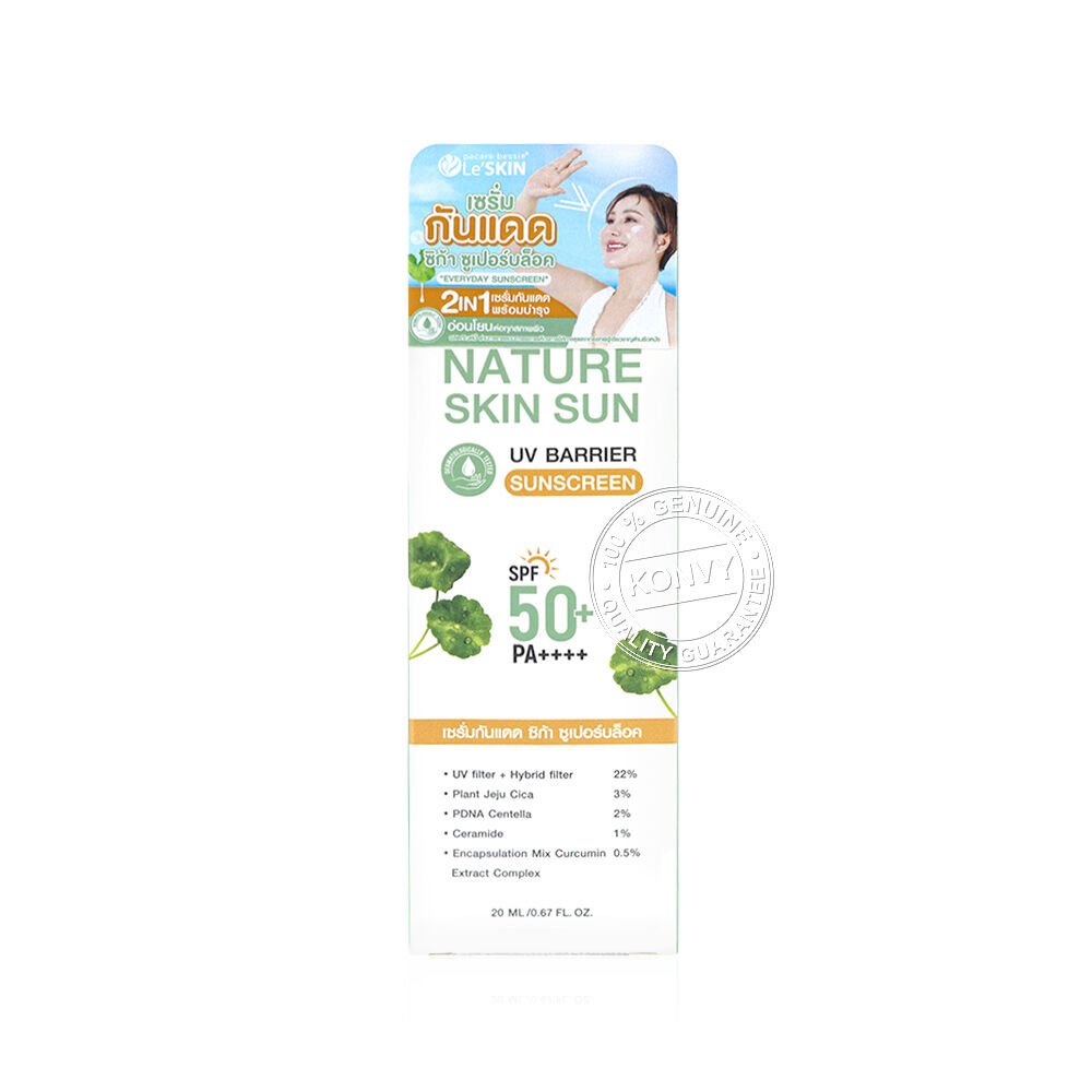 Le'SKIN Nature Skin Sun UV Barrier Sunscreen SPF50+ PA++++ 20ml กันแดดสูตรบำรุงผิว นวัตกรรมผสมผสานป้องกันและบำรุง สามารถปกป้องผิวจากรังสี UVA1, UVA2, UBV, IR, Blue light, Anti-pollution ด้วยสารสกัดจากพืช Plant Jeju Cica, Phyto DNA Centella ช่วยปลอบประโลมผิว บำรุงผิวอ่อนแอ และเสริม Skin Barrier ให้ผิวชุ่มชื้นแข็งแรงจากเซราไมด์ คอมเพลกซ์ 4 ชนิด ทั้งยังมี Encapsulation Curcumin Extract Complex ที่มีสาร Antioxidant ให้ผิวเปล่งปลั่ง สุขภาพดี ปกป้องผิวจากมลภาวะ ลดโอกาสการเกิดสิว เนื้อสัมผัสอ่อนโยน บางเบา ไม่เหนียวเหนอะหนะ ใช้ได้กับทุกสภาพผิว