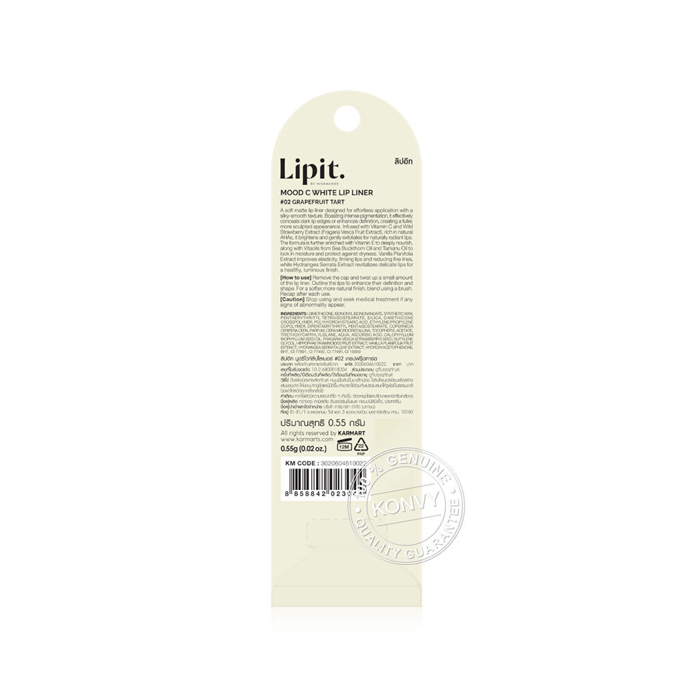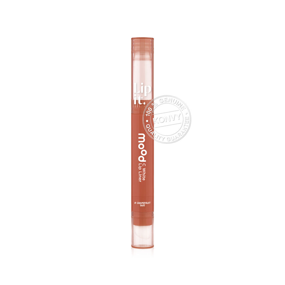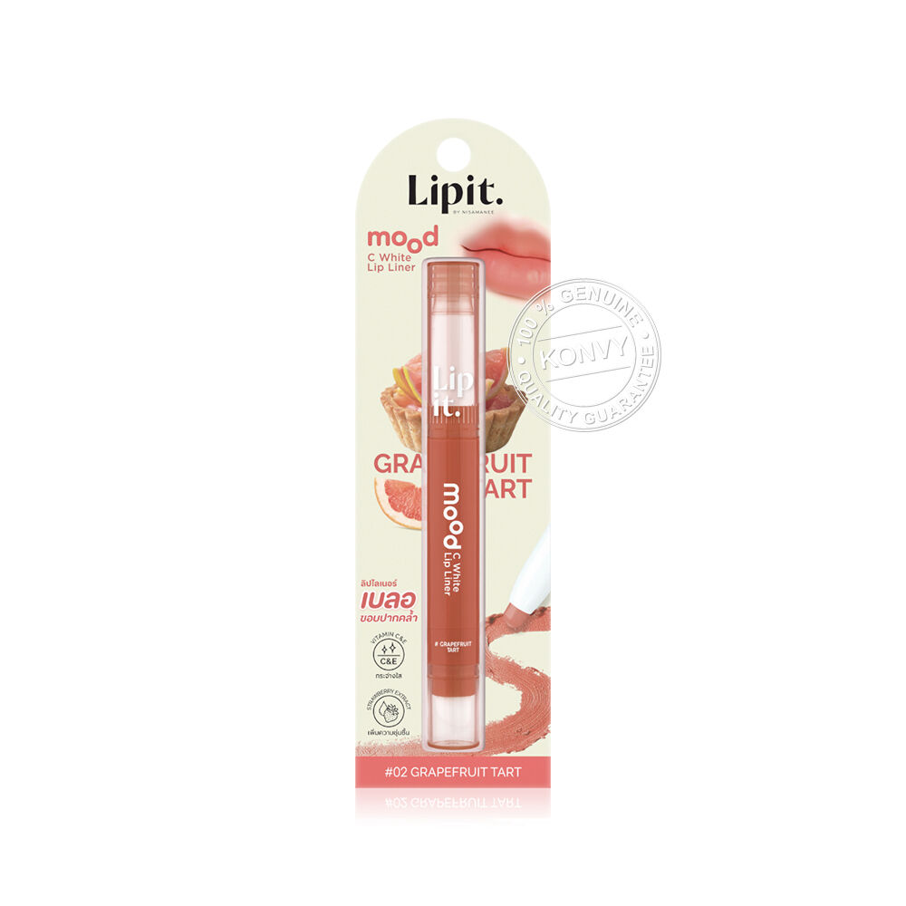 Lip It Mood C White Lip Liner 0.55g #02 Grapefruit Tart ลิปไลเนอร์เนื้อซอฟต์แมท สัมผัสเนียนนุ่ม เขียนง่าย เม็ดสีแน่น ใช้กลบขอบปากคล้ำให้เนียนสนิท หรือสามารถใช้เขียนกรอบเพื่อสร้างมิติให้ขอบปากคมชัด ดูอวบอิ่มขึ้น เผยความสดใสให้ริมฝีปากด้วยวิตามินซี และสารสกัดสตรอว์เบอร์รี่ป่า (Fragaria Vesca Fruit Extract) ที่มีสาร AHA จากธรรมชาติ ช่วยผลัดความหมองคล้ำของริมฝีปากให้กระจ่างใส ผสานพลังวิตามินอี ดูแลริมฝีปากให้เนียนนุ่ม พร้อมล็อกความชุ่มชื้นด้วย Vitaoils จากน้ำมันซีบัคธอร์น (Sea buckthorn Oil) และน้ำมันทามานู (Tamanu Oil) ช่วยปกป้องริมฝีปากจากความแห้งกร้าน ผสานการบำรุงจากสารสกัดวานิลลาแพลนนิโฟเลีย (Vanilla Planifolia Extract) เพิ่มความยืดหยุ่นให้ริมฝีปากกระชับ และสารสกัดจากดอกไฮเดรนเยีย (Hydrangea Serrata Extract) ฟื้นบำรุงริมฝีปากบอบบางให้กลับมาเปล่งประกายสุขภาพดี