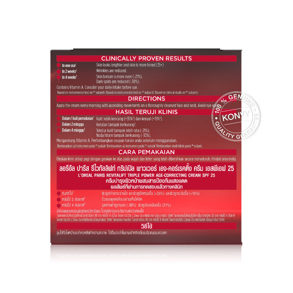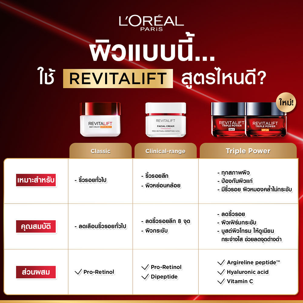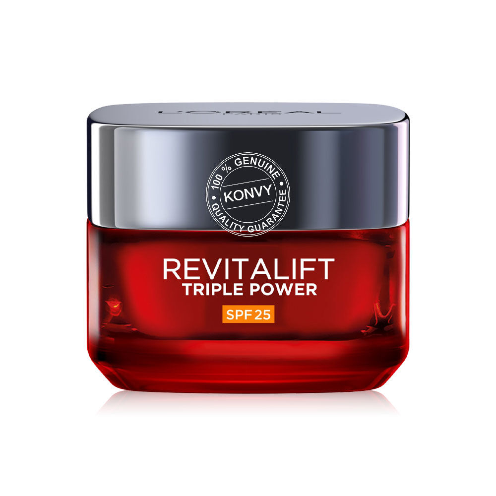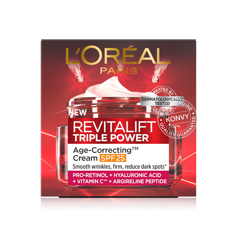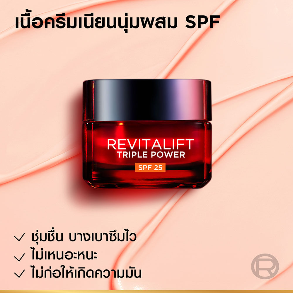 LOreal Paris Revitalift Triple Power Age-Correcting Cream SPF25 50ml ครีมบำรุงผิวสำหรับกลางวัน เนื้อบางเบา ซึมซาบเร็ว ไม่เหนียวเหนอะหนะ ช่วยลดเลือนริ้วรอยลึก ผิวดูกระชับอิ่มฟู และลดเลือนจุดด่างดำ เผยผิวเนียนใส พร้อมปกป้องผิวจากแสงแดดด้วย SPF25