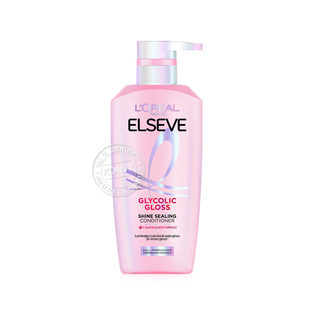 Loreal Paris Elseve Glycolic Gloss Shine Sealing Conditioner 375ml ครีมนวดผมสำหรับผมหยาบกระด้าง ขาดความเงางาม ช่วยฟื้นบำรุง และปิดเคลือบเกล็ดผม ล็อคความเงางาม ผสานคุณค่าบำรุง 4% จาก Glycolic Acid Complex ซึ่งได้รับแรงบันดาลใจจากการดูแลผิว ช่วยเติมเต็มและฟื้นบำรุงเส้นผมอย่างล้ำลึก เพื่อผมดูกลอสเงางาม เล่นแสง ดูสุขภาพดี