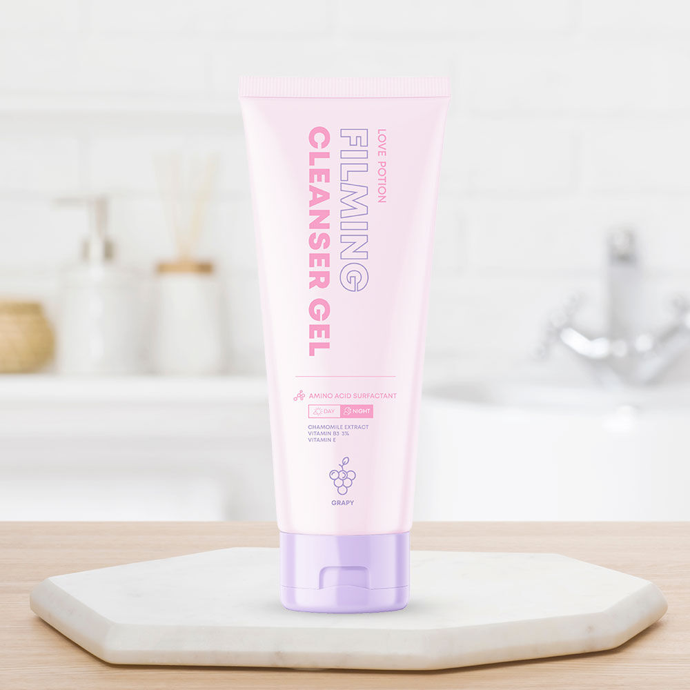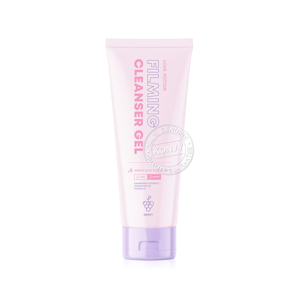 LOVE POTION Filming Cleanser Gel Grapy 75ml เจลล้างหน้าเกรปปี้ ฟองนุ่ม กลิ่นหอมสดชื่น ผสานสารสกัดจาก Chamomile Extract, Pollustop และ Sodium Hyaluronate ช่วยทำความสะอาดผิวหน้าอย่างอ่อนโยนและหมดจด โดยไม่ทำให้ผิวแห้งตึง ช่วยปลอบประโลมผิวให้รอยแดงแลดูจางลง พร้อมด้วย Vitamin B3 และ Vitamin E ช่วยเติมความชุ่มชื้น เผยผิวเนียนนุ่ม แลดูกระจ่างใส