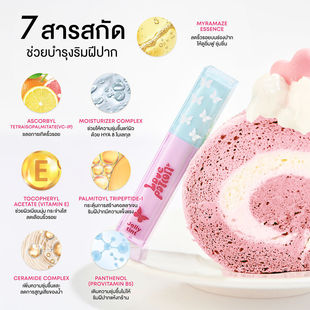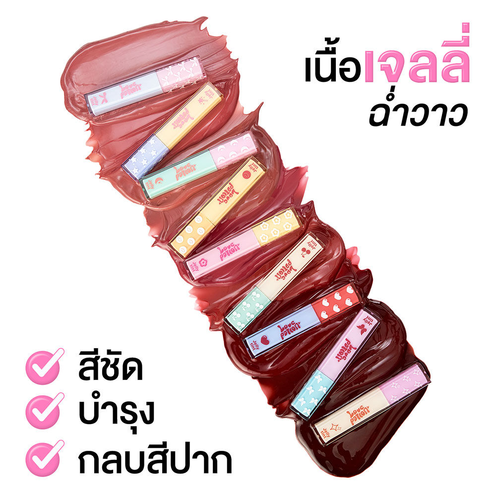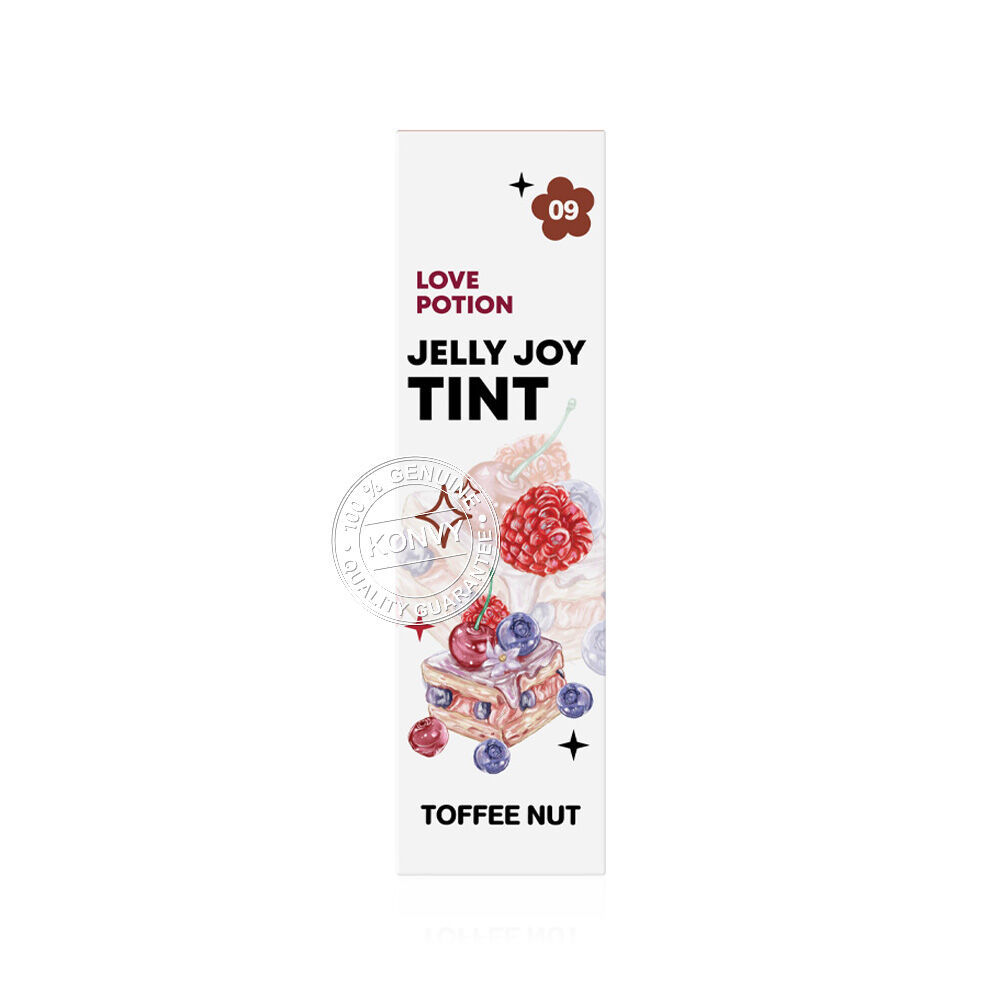 LOVE POTION Jelly Joy Tint 2.5g #09 Toffee Nut ลิปทินท์เนื้อเจลลี่นุ่ม สัมผัสบางเบา เม็ดสีชัด ติดทนนาน ทิ้งสเตนสีสวย ไม่เหนียวเหนอะหนะ อุดมด้วยสารบำรุง Ceramide Complex, Vitamin E, Vitamin C และ Pro-Vitamin B5 ช่วยฟื้นบำรุงและเติมความชุ่มชื้นให้ริมฝีปาก พร้อมด้วย Palmitoyl Tripeptide-1, Moisturizer Complex และสารสกัดพืชคืนชีพ (Myramaze Essence) ช่วยลดเลือนริ้วรอยร่องปาก เผยริมฝีปากเนียนนุ่ม ดูอวบอิ่ม น่าสัมผัส