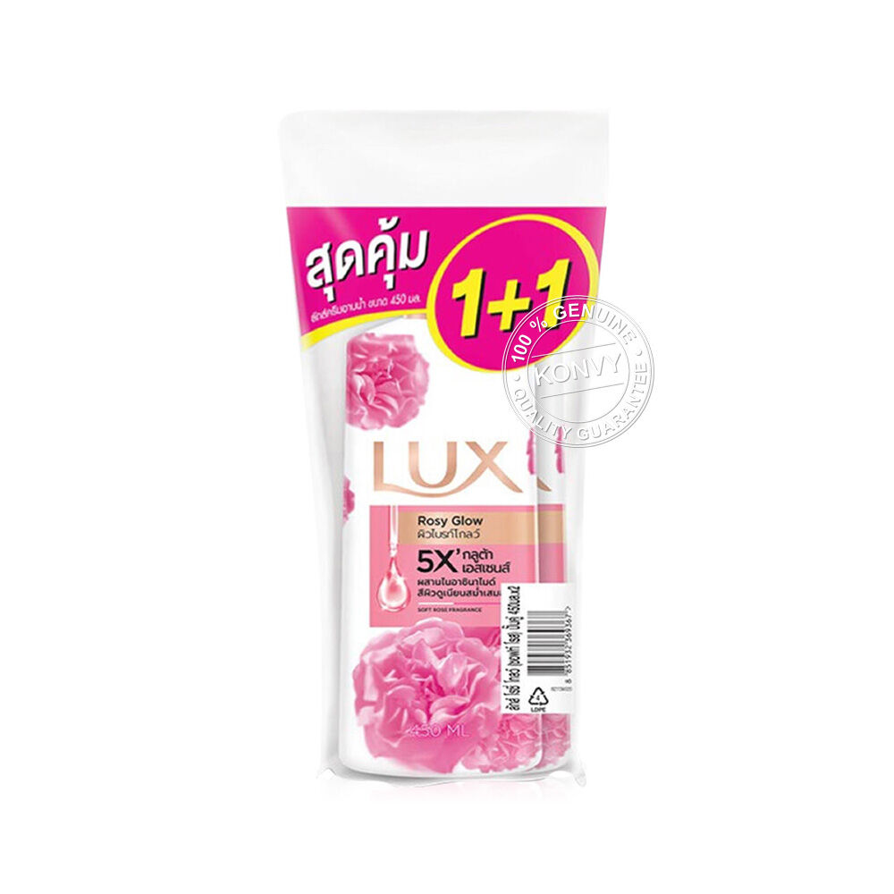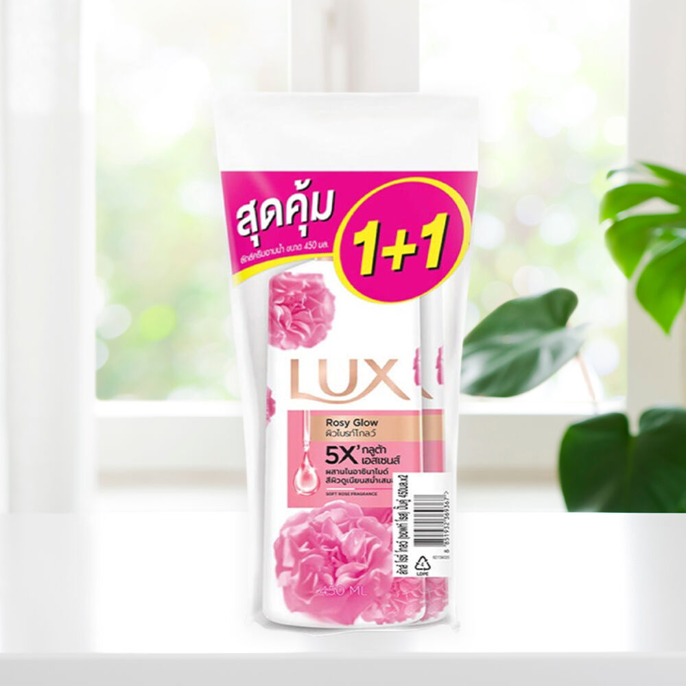 Lux Rosy Glow Body Wash [450ml x 2pcs] ครีมอาบน้ำ ตัวช่วยในการปรนนิบัติผิวให้เนียนนุ่มชุ่มชื้นน่าสัมผัส ด้วยไบร์ทเทนนิ่ง เอสเซนส์ และไนอาซินนาไมด์ที่ช่วยบำรุง และเติมมอยส์เจอร์ไรเซอร์ให้ผิวในขณะอาบน้ำ พร้อมกลิ่นหอมเย้ายวนใจจากกุหลาบที่สร้างสรรค์โดยผู้เชี่ยวชาญน้ำหอมระดับโลก