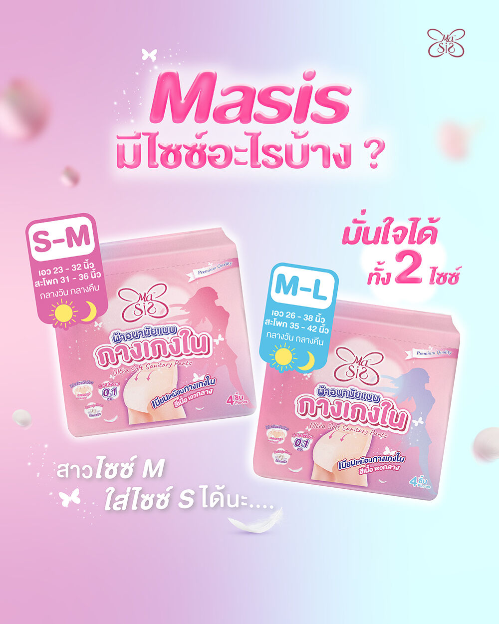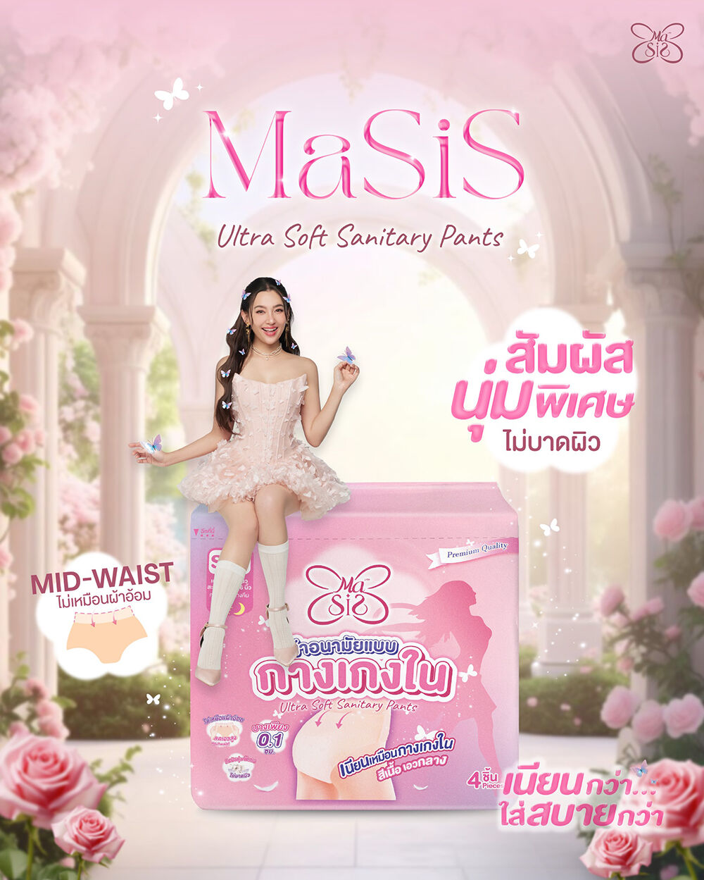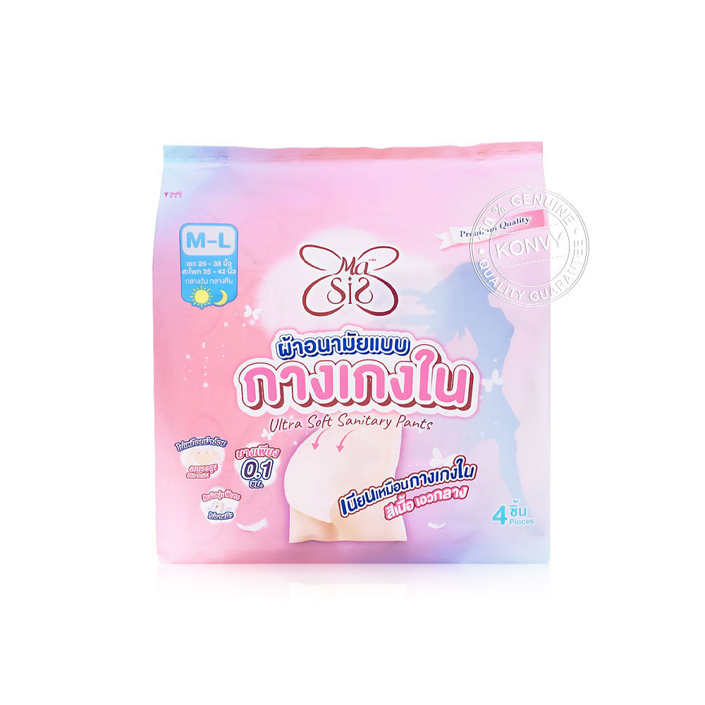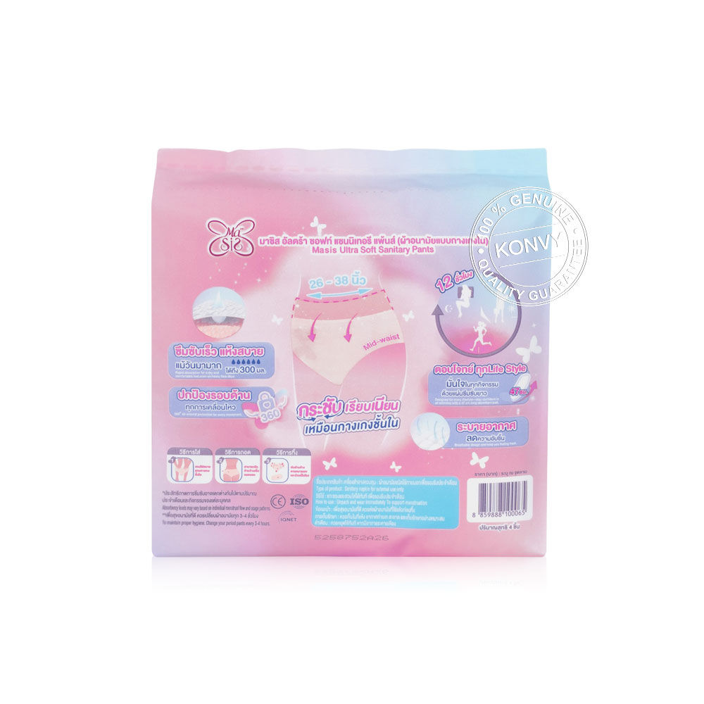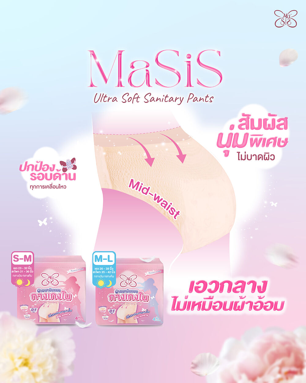 Masis ผ้าอนามัยแบบกางเกงใน Ultra Soft Sanitary Pants Size M-L 4pcs ผ้าอนามัยแบบกางเกงใน ไซส์ M-L สัมผัสนุ่มพิเศษ ไม่บาดผิว บางเพียง 0.1 ซม. ซึมซับเร็ว แห้งสบาย ขอบเอวยืดหยุ่น ใส่สบาย กระชับเรียบเนียนเหมือนใส่กางเกงชั้นใน ปกป้องรอบด้าน ตอบโจทย์ทุกไลฟ์สไตล์ มั่นใจทุกกิจกรรม