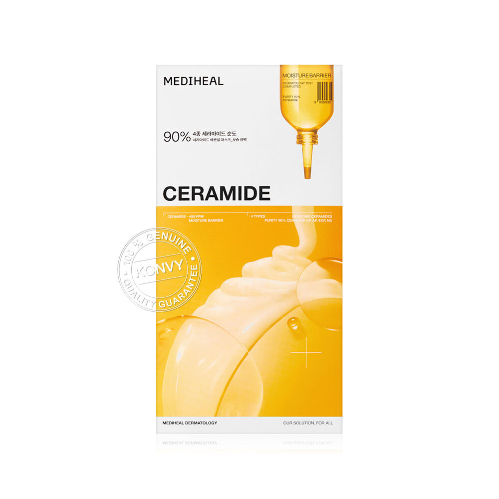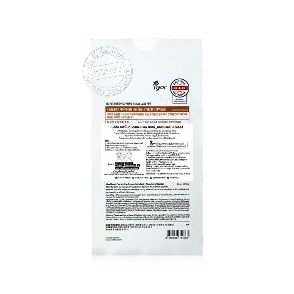 Mediheal Ceramide Essential Mask Moisture Barrier Box [24ml x 4pcs] แผ่นมาสก์หน้าสูตรเข้มข้น เติมความชุ่มชื้น พร้อมเสริมปราการปกป้องผิวให้แข็งแรง ผสานเซราไมด์ 4 ชนิดในรูปแบบไลโปโซม ช่วยให้สารบำรุงซึมซาบสู่ผิวได้อย่างมีประสิทธิภาพ เสริมเกราะป้องกันผิวจากความแห้งกร้าน ให้ผิวชุ่มชื้นได้ยาวนานตลอดวัน