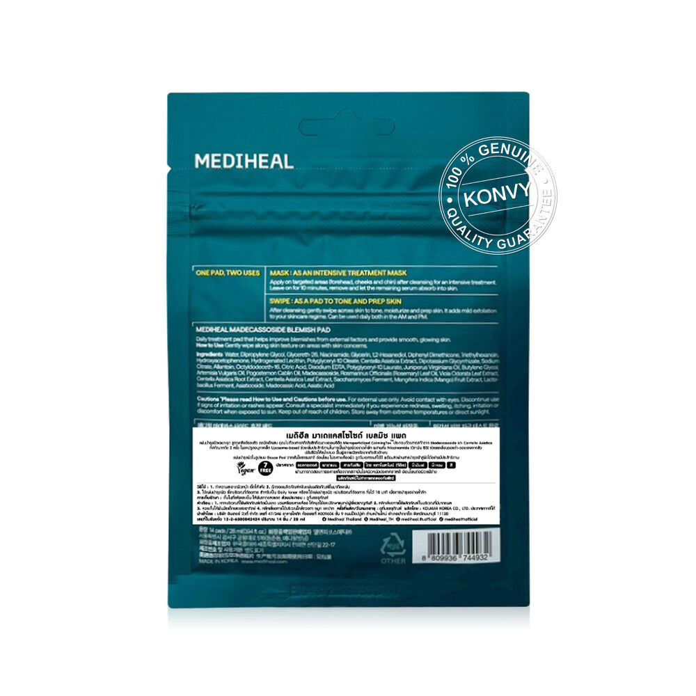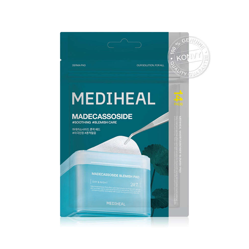 Mediheal Madecassoside Blemish Pad 14 Pads แผ่นบำรุงผิวเฉพาะจุด ขนาดพกพา สูตรเคลียร์รอยสิว ลดผิวอักเสบ ด้วยประสิทธิภาพ Microparticlized CalmingTox™ ประกอบด้วยสารสกัดจาก Centella Asiatica และ Madecassoside ที่พัฒนาโดยเทคโนโลยี Liposome-based ผสานกับ Niacinamide (Vitamin B3) ช่วยลดเลือนรอยดำ รอยแดงจากสิว พร้อมปรับสีผิวให้สม่ำเสมอ และฟื้นฟูสภาพผิวหลังจากเกิดสิวอักเสบ