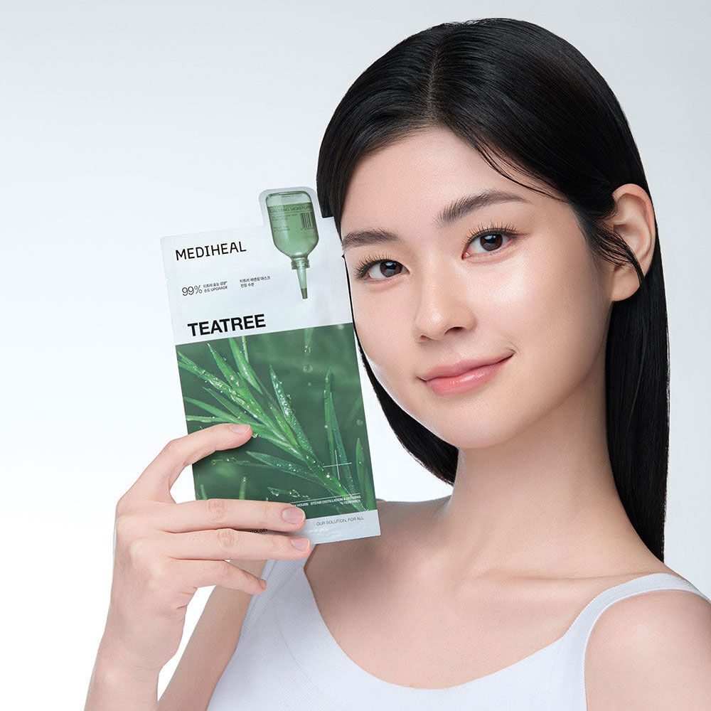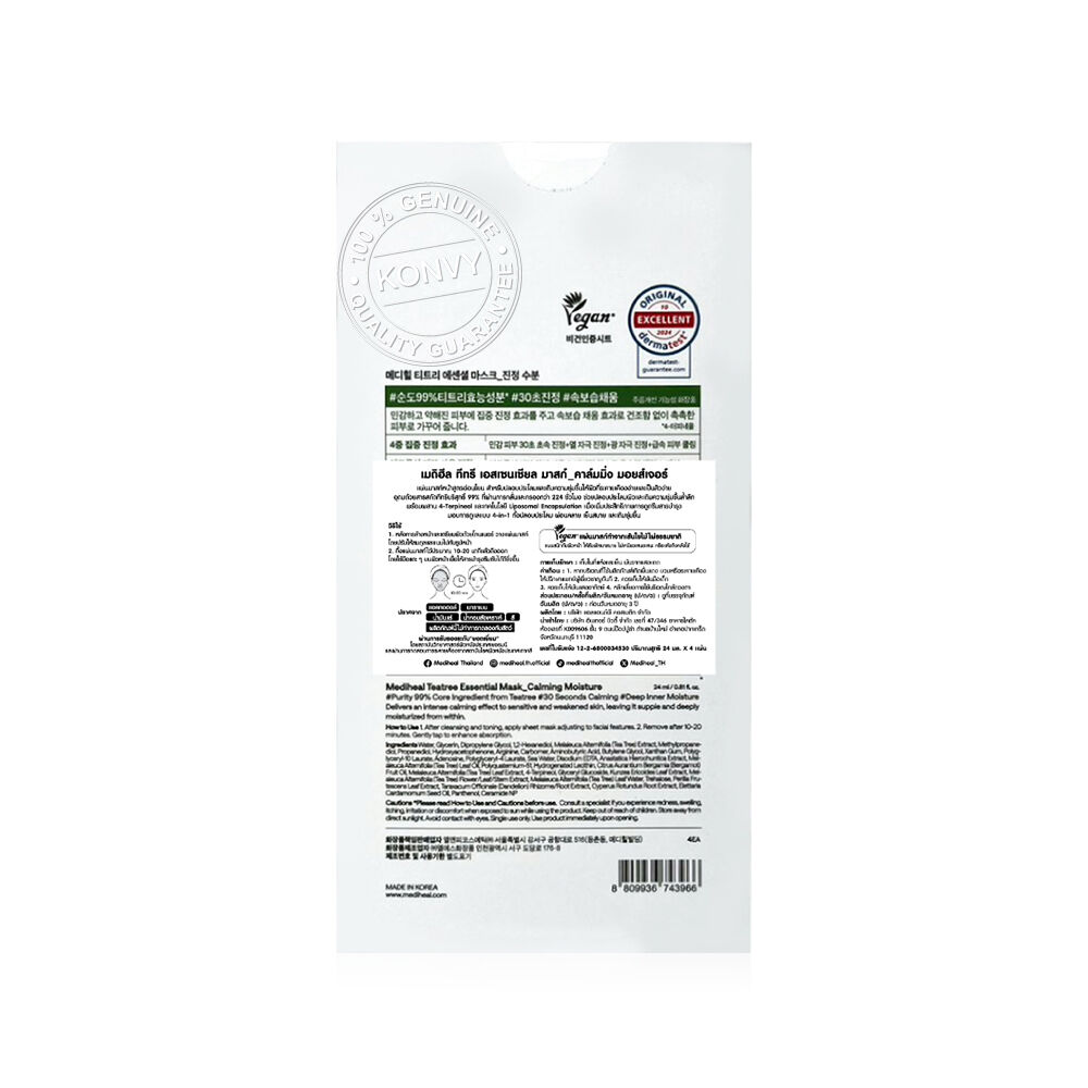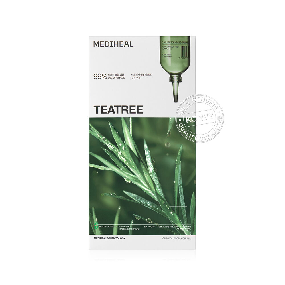 Mediheal Teatree Essential Mask Calming Moisture Box [24ml x 4pcs] แผ่นมาสก์ดูแลผิวหน้า อัดแน่นไปด้วยสารสกัด Purity Teatree 99%, 4-Terpineol และเทคโนโลยี Liposome ที่ช่วยให้เอสเซนส์ซึมเข้าสู่ผิวได้อย่างมีประสิทธิภาพ ช่วยปลอบประโลมผิว ให้ผิวรู้สึกผ่อนคลาย พร้อมช่วยเติมความชุ่มชื้นให้ผิวอย่างล้ำลึก เผยผิวเนียนนุ่ม ดูสุขภาพดี