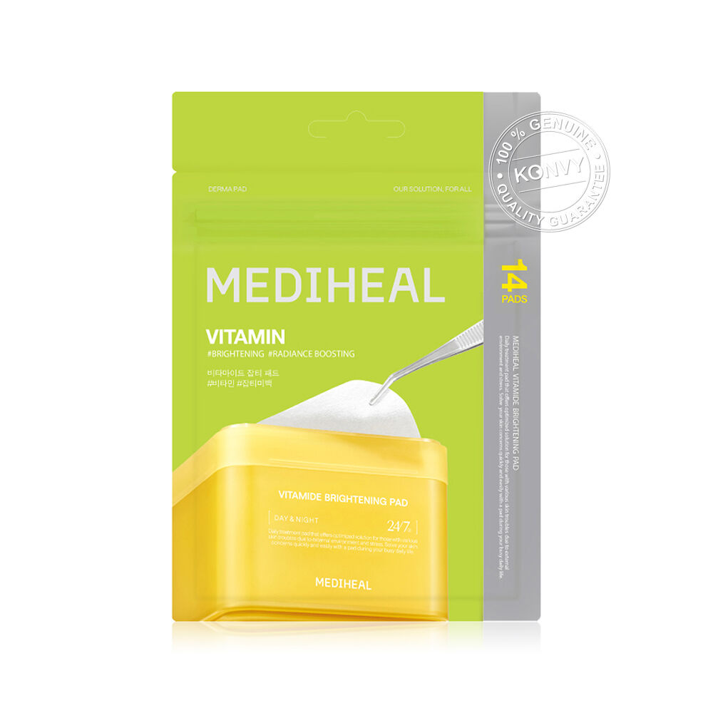 Mediheal Vitamide Brightening Pad 14 Pads แผ่นบำรุงผิวเฉพาะจุด ขนาดพกพา สูตรวิตามินซีเข้มข้น ช่วยปรับผิวกระจ่างใส ด้วยประสิทธิภาพจาก Microparticlized Vitamide™ สารสกัดจากเอสเซนส์วิตามินที่จำเป็น 7 ชนิด ในรูปแบบแคปซูลอนุภาคเล็ก Liposome-based ช่วยคงคุณภาพของสารสกัดสำคัญและเพิ่มการซึมผ่านได้ดี ผสานส่วนผสมของวิตามินเข้มข้นจากซีบัคธอร์น, ไนอะซินาไมด์ 3%, สารสกัดจากชะเอมเทศ และน้ำมันจากธรรมชาติกว่า 10 ชนิด
