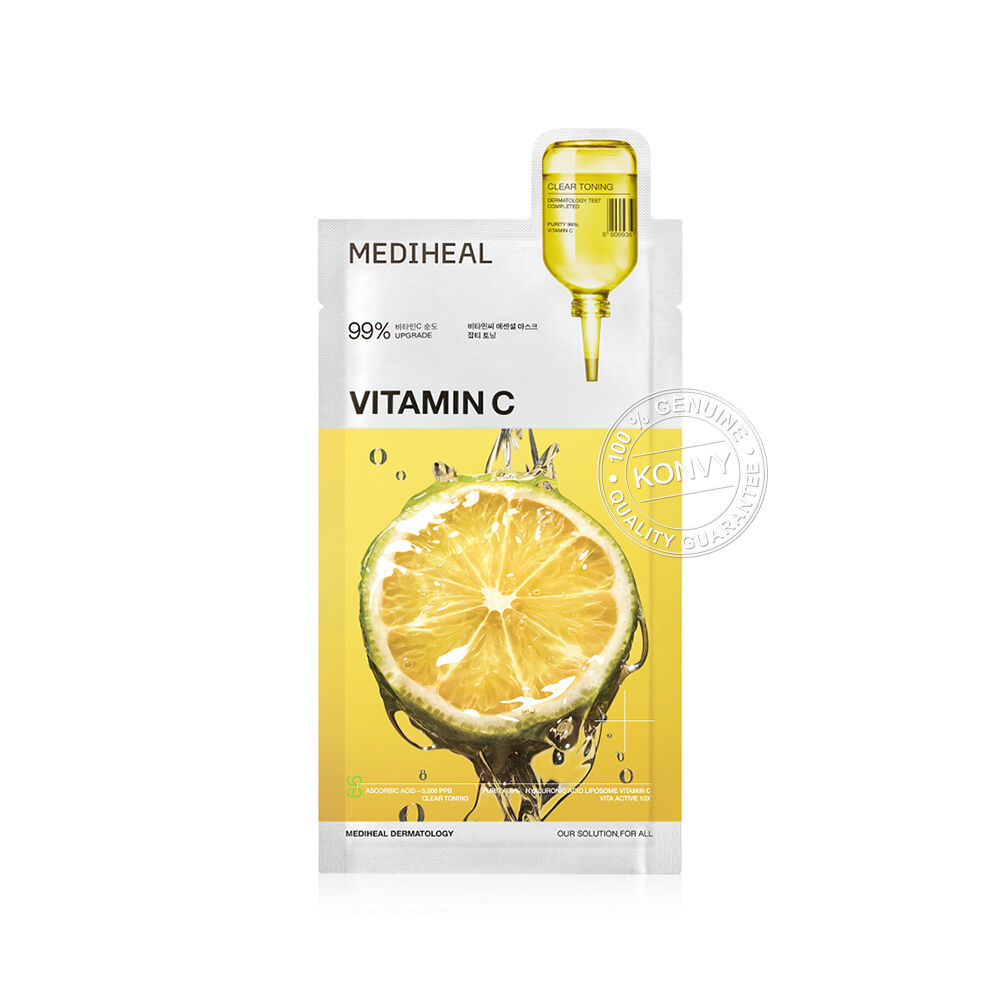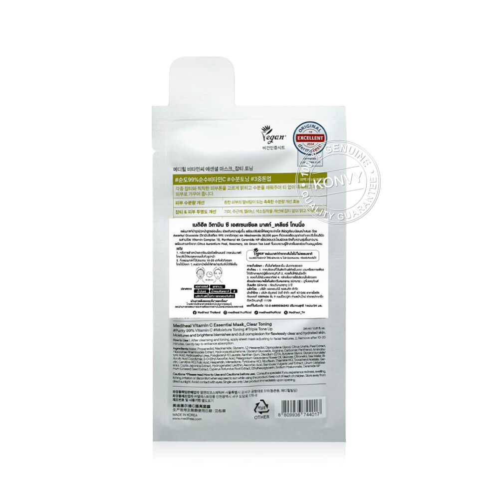 Mediheal Vitamin C Essential Mask Clear Toning [24ml x 10pcs] แผ่นมาสก์หน้าสูตรอ่อนโยน ช่วยเติมความชุ่มชื้น พร้อมปรับผิวให้แลดูกระจ่างใส สีผิวดูเรียบเนียนสม่ำเสมอ ด้วยวิตามินซีบริสุทธิ์ จากอังกฤษ (Ascorbyl Glucoside) และ Niacinamide 30,000 ppm ที่ช่วยลดเลือนจุดด่างดำ และปรับโทนสีผิว ผสานด้วยวิตามินรวม 10 ชนิด แพนทีนอล และเซราไมด์ NP เพื่อปลอบประโลมผิวและกักเก็บความชุ่มชื้นยาวนาน พร้อมสารสกัดจากเปลือกส้ม โรสแมรี่ และชาเขียว ที่มอบความรู้สึกสดชื่น