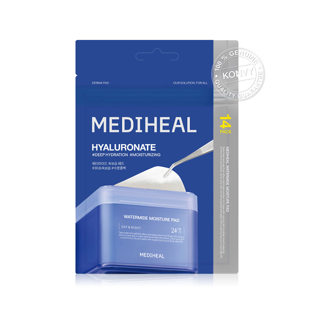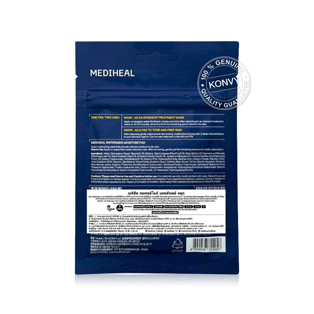 Mediheal Watermide Moisture Pad 14 Pads แผ่นบำรุงผิวเฉพาะจุด ขนาดพกพา สูตรเข้มข้นเติมความชุ่มชื้นให้ผิวอย่างล้ำลึก ด้วยประสิทธิภาพจาก Microparticlized WaterActive™ ผ่านการสกัดเย็น 24 ชั่วโมง ด้วยน้ำแร่ธรรมชาติไอซ์แลนดิก เกลเซียล พัฒนาโดยเทคโนโลยี Liposome-based ผสานกับ 10 types Hyaluronic Acid, Squalane, Glycerin และ Allantoin ช่วยเติมความชุ่มชื้นและกักเก็บน้ำในชั้นผิว ฟื้นฟูผิวแห้ง ลดความหยาบกร้าน ให้ผิวเนียนนุ่ม อิ่มน้ำ และช่วยลดอุณหภูมิผิว ลดอาการแพ้ระคายเคือง